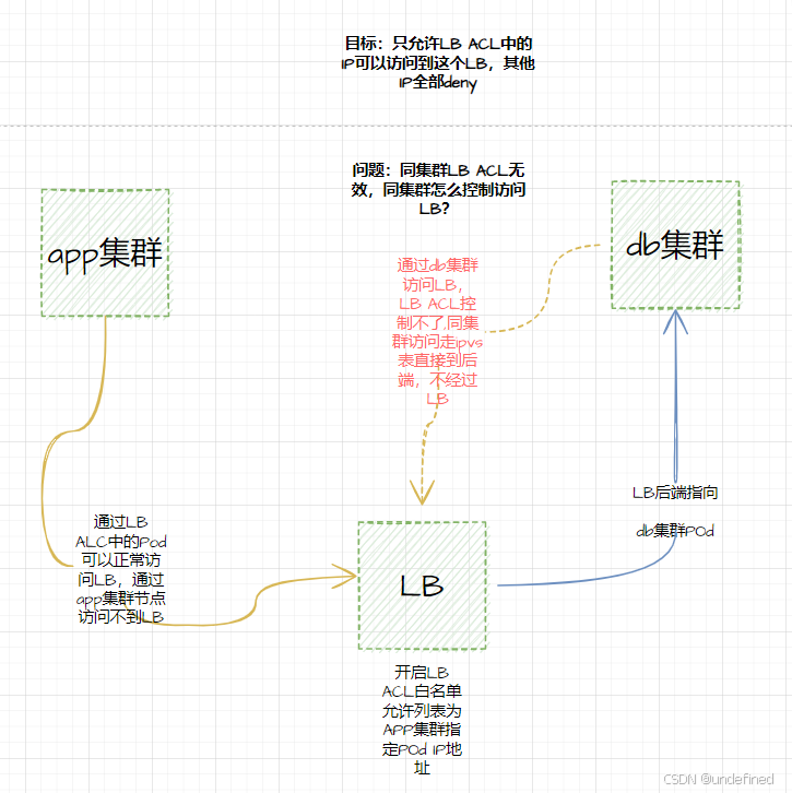 当前应用通过db集群的Service(svc)地址连接数据库,实质上是通过负载均衡(LB)进行通信。为了增强安全性,我们计划通过在LB上配置ACL白名单来限制连接源。但是,由于app集群的生产环境和UAT环境处于同一子网,无法通过网段来配置ACL,因此需要采用固定Pod IP地址来进行访问控制。