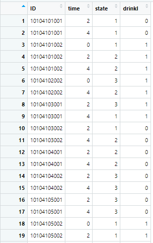 这个是个非常简单的数据,而且是模拟数据,不对临床操作产生建议,time是时间,state这里是我自定义的,我把肾功能的肌酐按低到高,把肾功能分成了3个状态,然后看这三个状态转换的概率,drinkl:是否饮酒。这里我们仍然使用一阶的马尔科夫链,