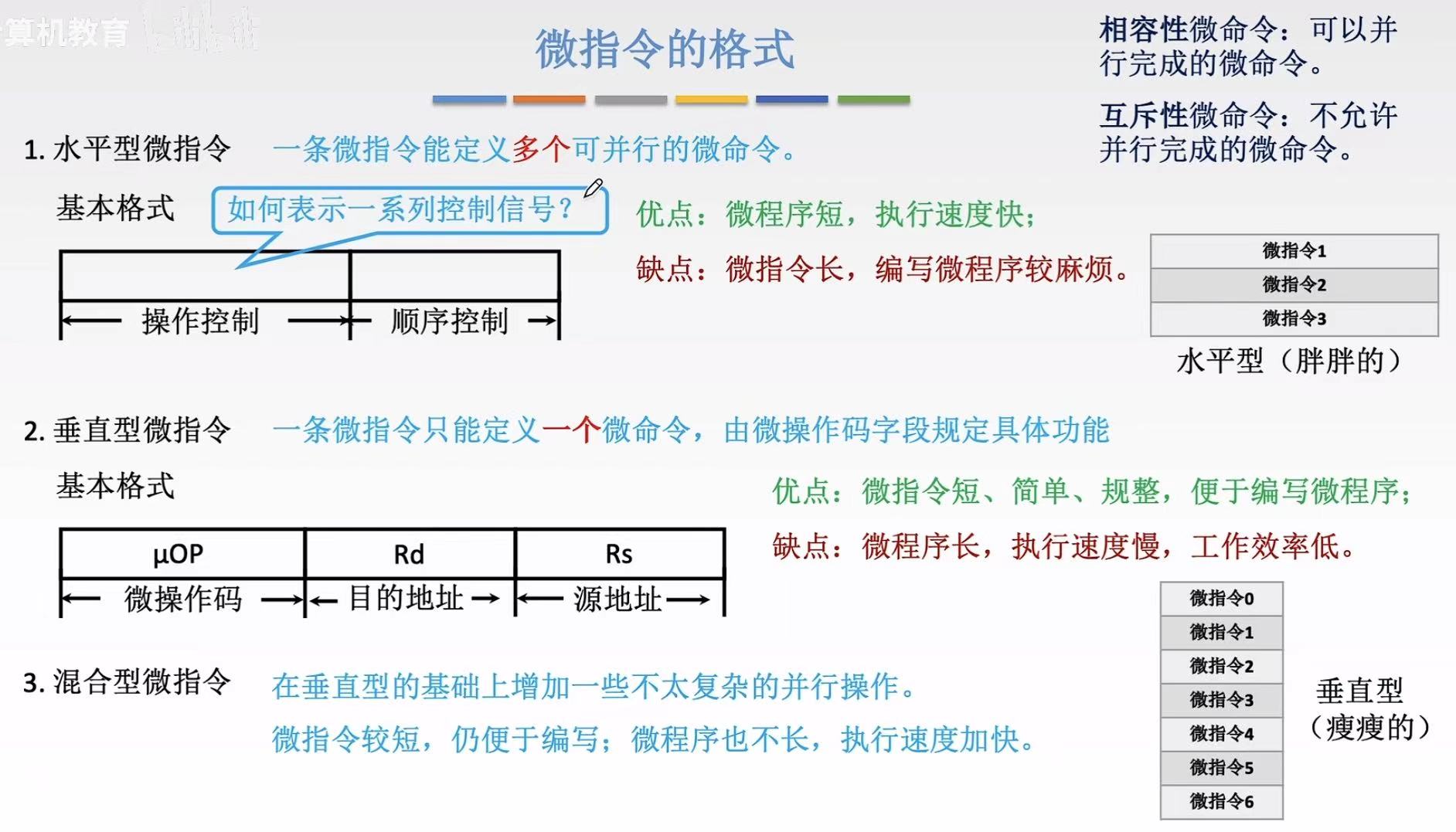 - 微指令基本格式:操作控制+顺序控制-->操作+地址