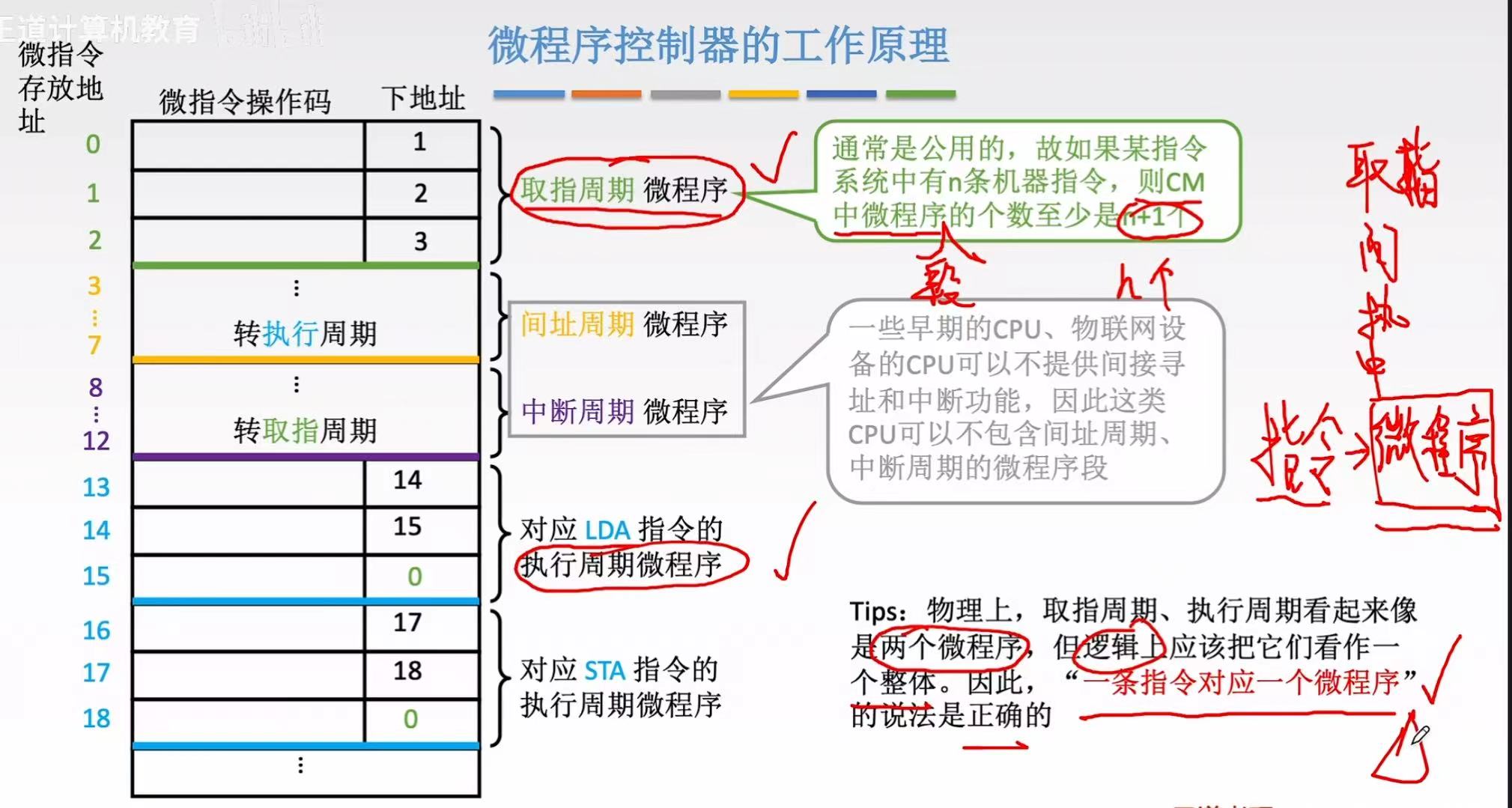 因为需要寻找下一次的地址,所以每个微指令之间还需要插入一个确认下一条微指令的地址的这一步(红字),当这个指令周期结束的时候,需要根据指令操作码确定即将进入的指令周期的微指令的首地址(紫字)