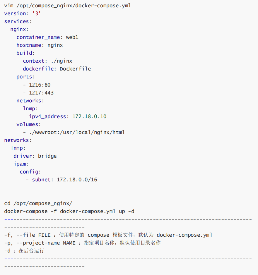 Docker-Compose 的工程配置文件默认为 docker-compose.yml ,可通过环境变量 COMPOSE_FILE 或 -f 参数自定义配置文件,其定义了多个有依赖关系的服务及每个服务运行的容器。