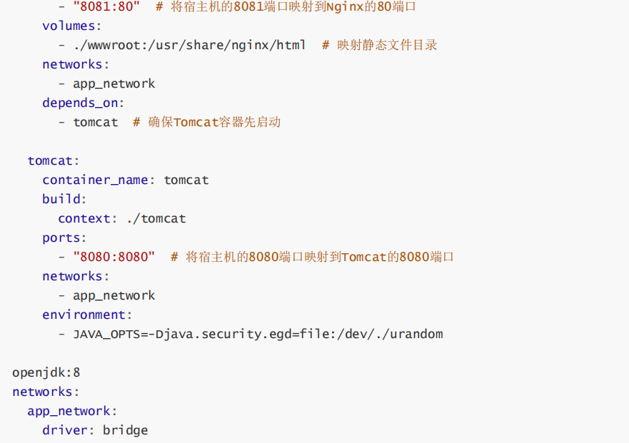 depends_on 确保 Nginx 服务启动时, Tomcat 服务已启动并运行。