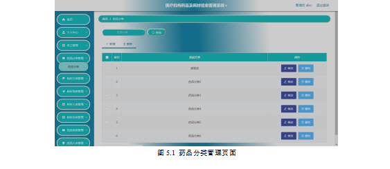 如图5.1显示的就是管理员对药品分类信息进行查询,添加,删除以及批量删除操作。