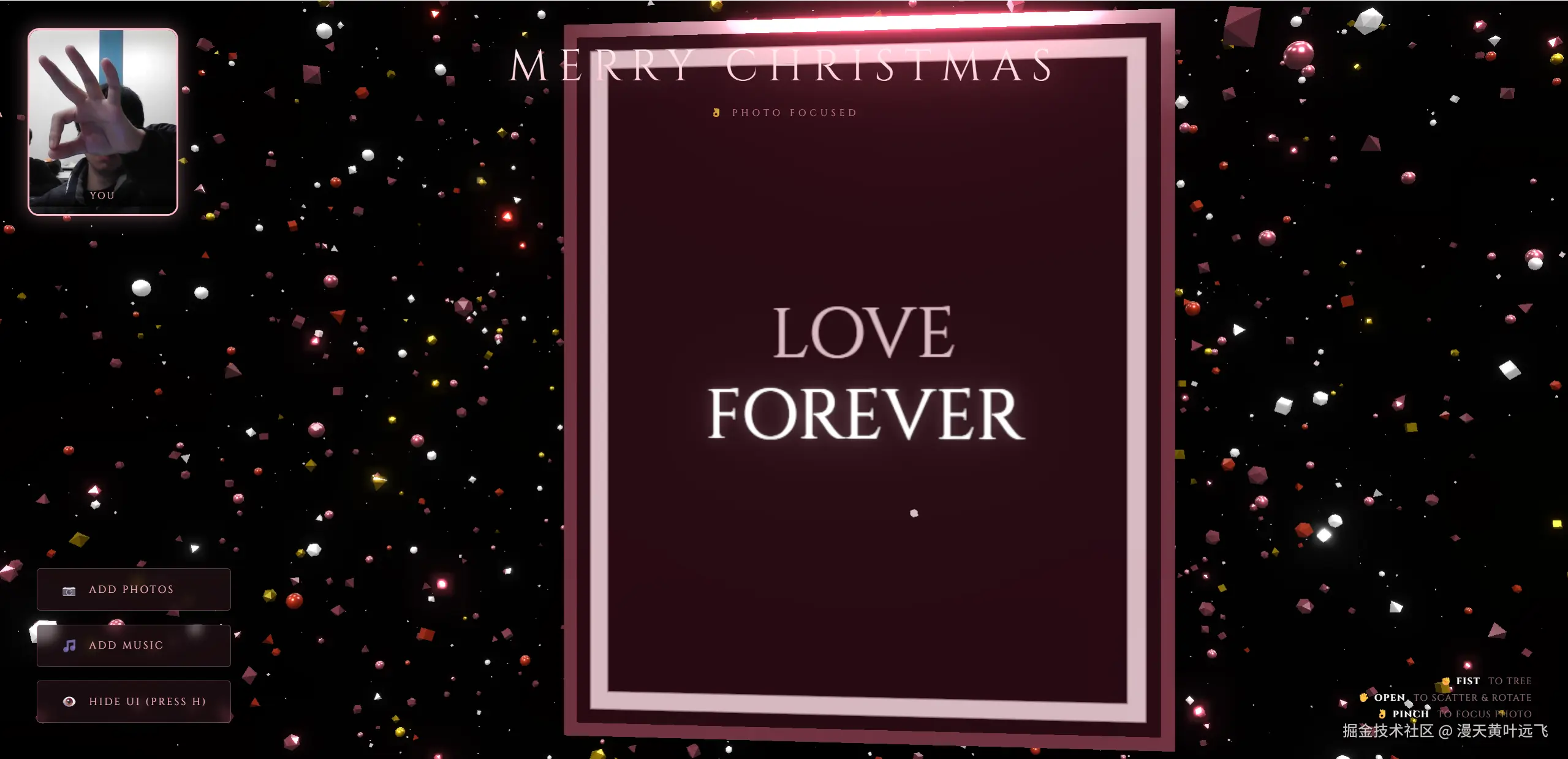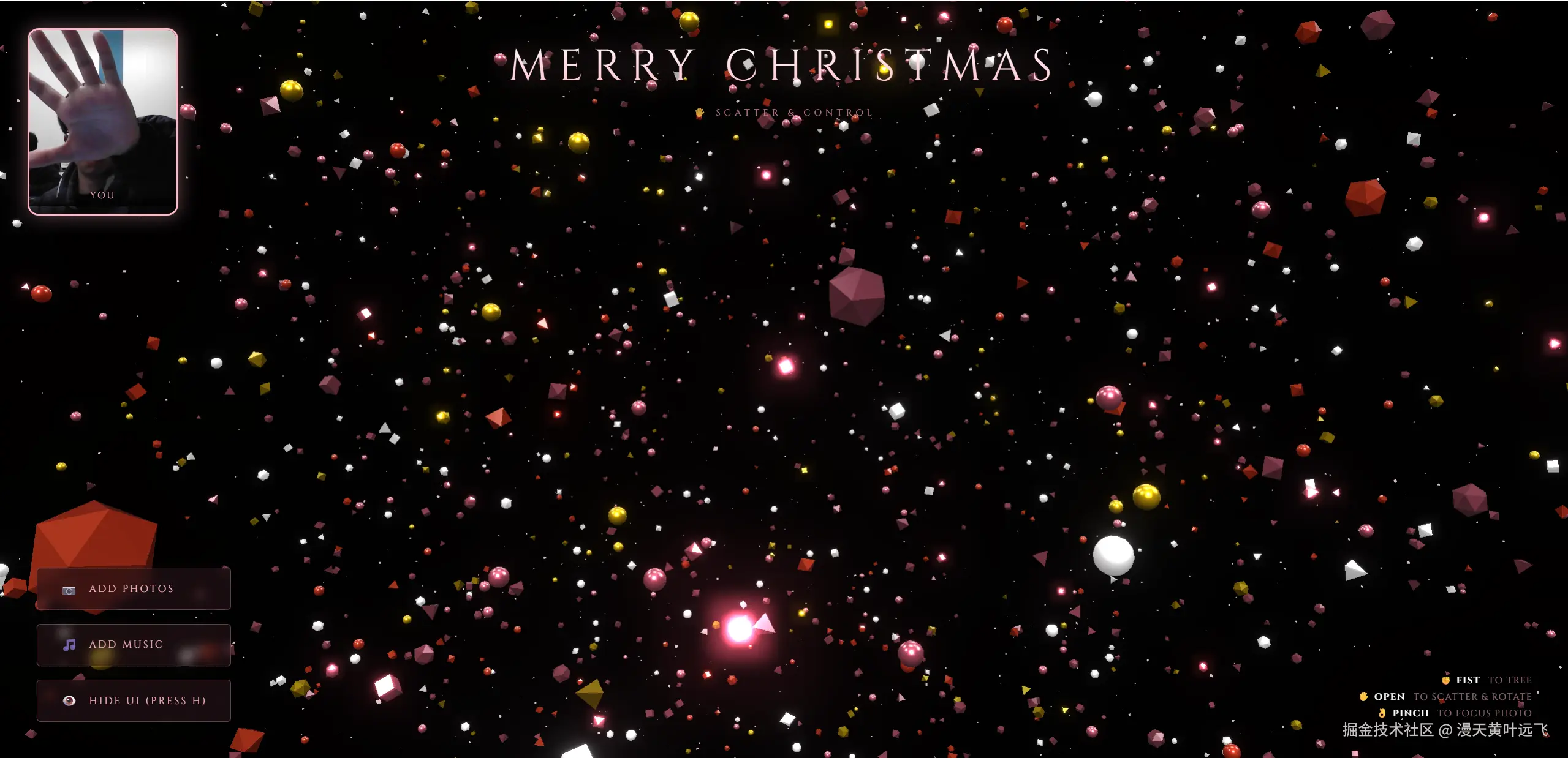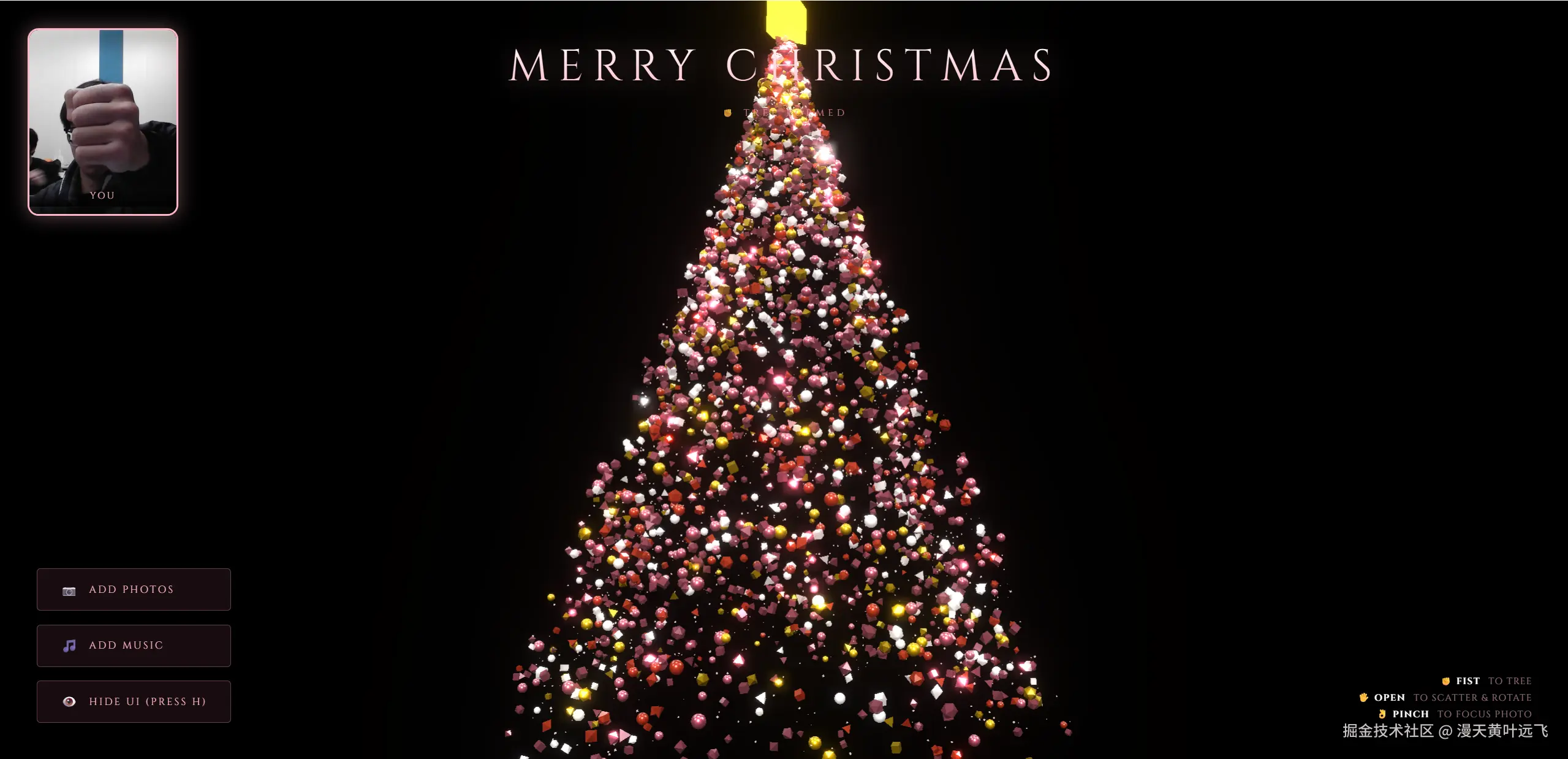 - 核心任务 编写一个包含 HTML、CSS 和 JavaScript 的单文件应用 (Single-file HTML)。该应用需要创建一个基于手势控制的 3D 粒子圣诞树,集成 MediaPipe 手势识别,并具备照片管理和音乐播放功能。
