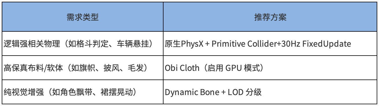 适用场景: 角色布娃娃、关卡交互物体、简单布料、碰撞反馈。关键优化实践: