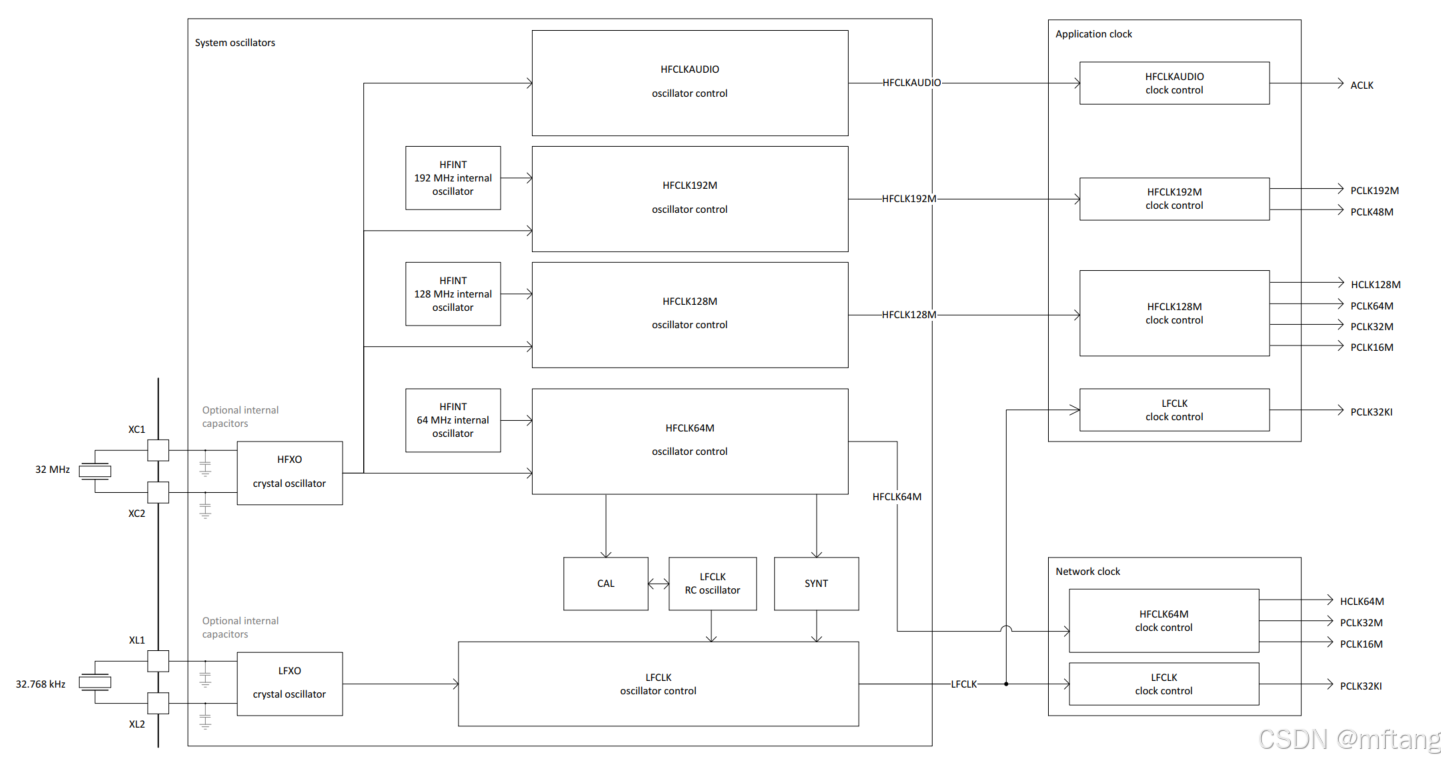 该时钟控制系统能够从一系列内部或外部的高频和低频振荡器中获取系统时钟,并根据各个外设和模块的特定需求将其分配给它们。时钟分配是自动化的,并且按照模块独立地进行分组,以限制时钟树中未使用分支的电流消耗。每个核心子系统都有自己的时钟控制系统,负责向电源和时钟子系统请求资源。