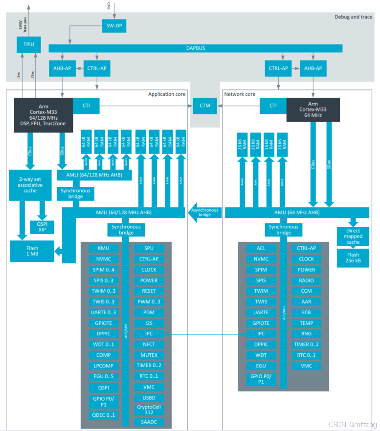 两个 Arm Cortex-M33 处理器与 Nordic Semiconductor 的 nRF51、nRF52 和 nRF91 系列 SoC 共享电源、时钟和外设架构,确保了最小的移植工作量。应用核心是一个功能齐全的 Arm Cortex-M33 处理器,包括 DSP 指令和 FPU,运行频率高达 128MHz,具有 1MB 的闪存和 512KB 的 RAM。选择以 64MHz 运行应用处理器可提高 CPU 的能效。网络核心是一个功能集精简的 Arm Cortex-M33 处理器,专为超低功耗运行而设计。它以固定的 64MHz 频率运行,包含 256KB 的闪存和 64KB 的 RAM。