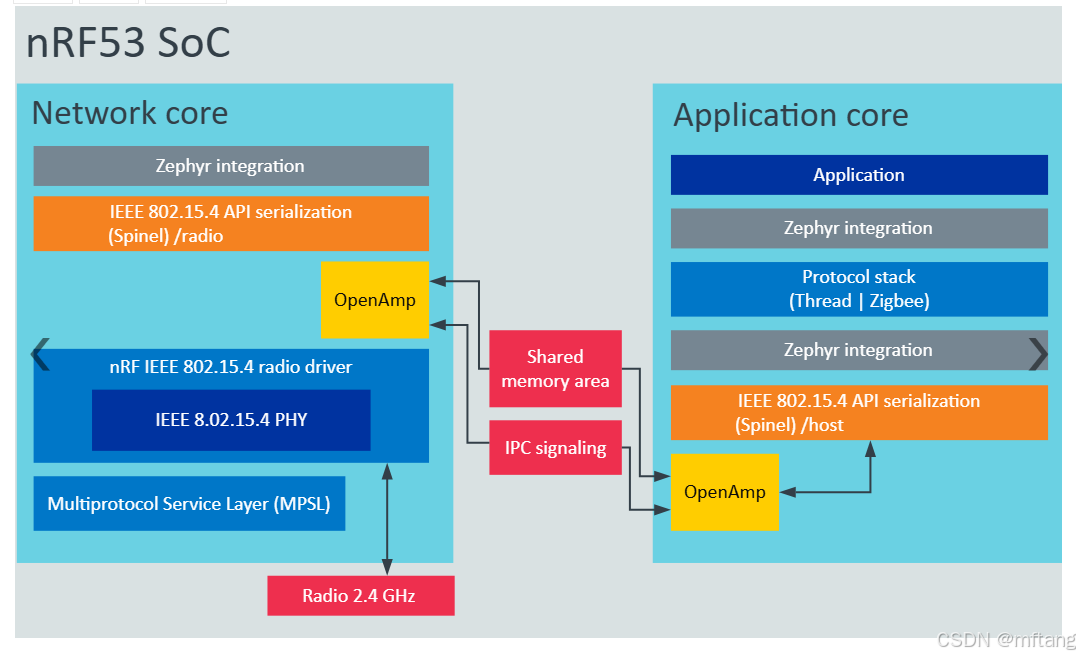 nRF5340 是一款无线、超低功耗的多核系统级芯片(SoC),集成了两个完全可编程的 Arm Cortex-M33 处理器、先进的安全特性、一系列外设以及一个支持多协议的 2.4GHz 收发器。该收发器支持蓝牙低功耗、ANT™ 以及 802.15.4 协议,包括 Thread 和 Zigbee 协议等,还允许实现专有的 2.4GHz 协议。