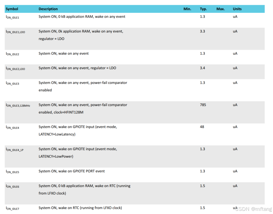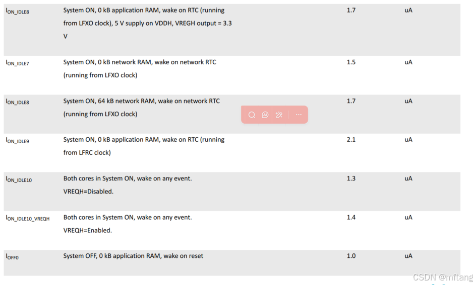 • 将应用核心时钟的频率设置为 128 MHz。在该模式下,这种增加的功耗在 CPU 进入睡眠状态(即执行 WFI(等待中断)或 WFE(等待事件)指令后)时也会被观察到。