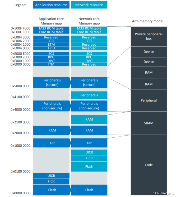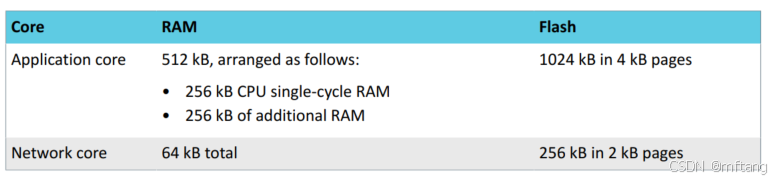 nRF5340 片上系统包含两个处理器内核,每个内核都有闪存和随机存取存储器,可用于代码和数据存储。