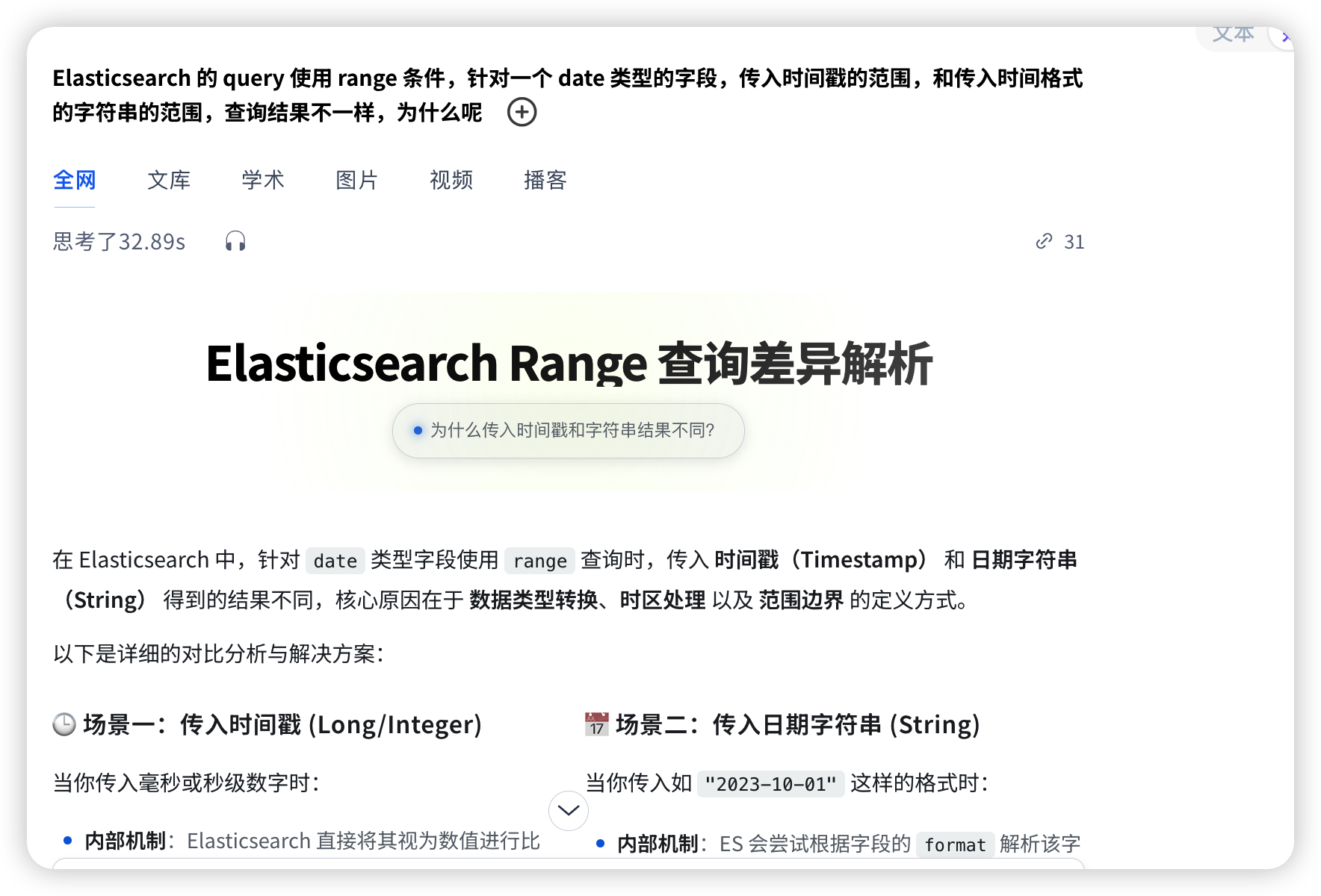 好一阵儿没有写 Elasticsearch 检索代码了,本周弄了一下,又回忆起一些坑点,记录一下。第一个就是 Elasticsearch 的字段类型,date 类型的字段设置查询条件时,参数值设置时,字符串和时间戳两种形式查询结果有差异,温故一下。