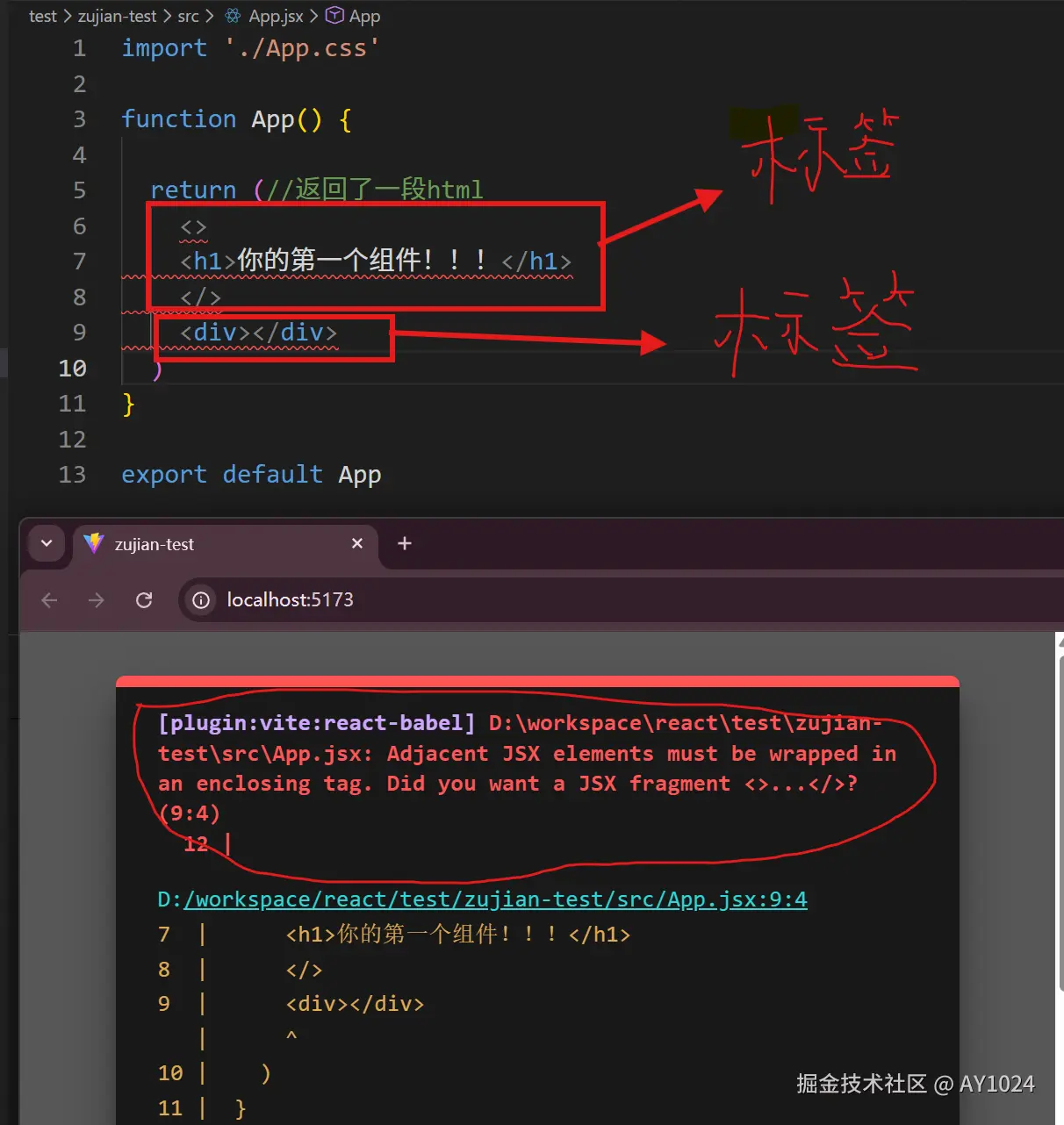 React.createElement()函数调用,而一个函数只能返回一个值。如果含多个最外层标签,那么会报错:Adjacent JSX elements must be wrapped in an enclosing tag,翻译过来就是:相邻的 JSX 元素必须被包裹在一个封闭的标签中。 -