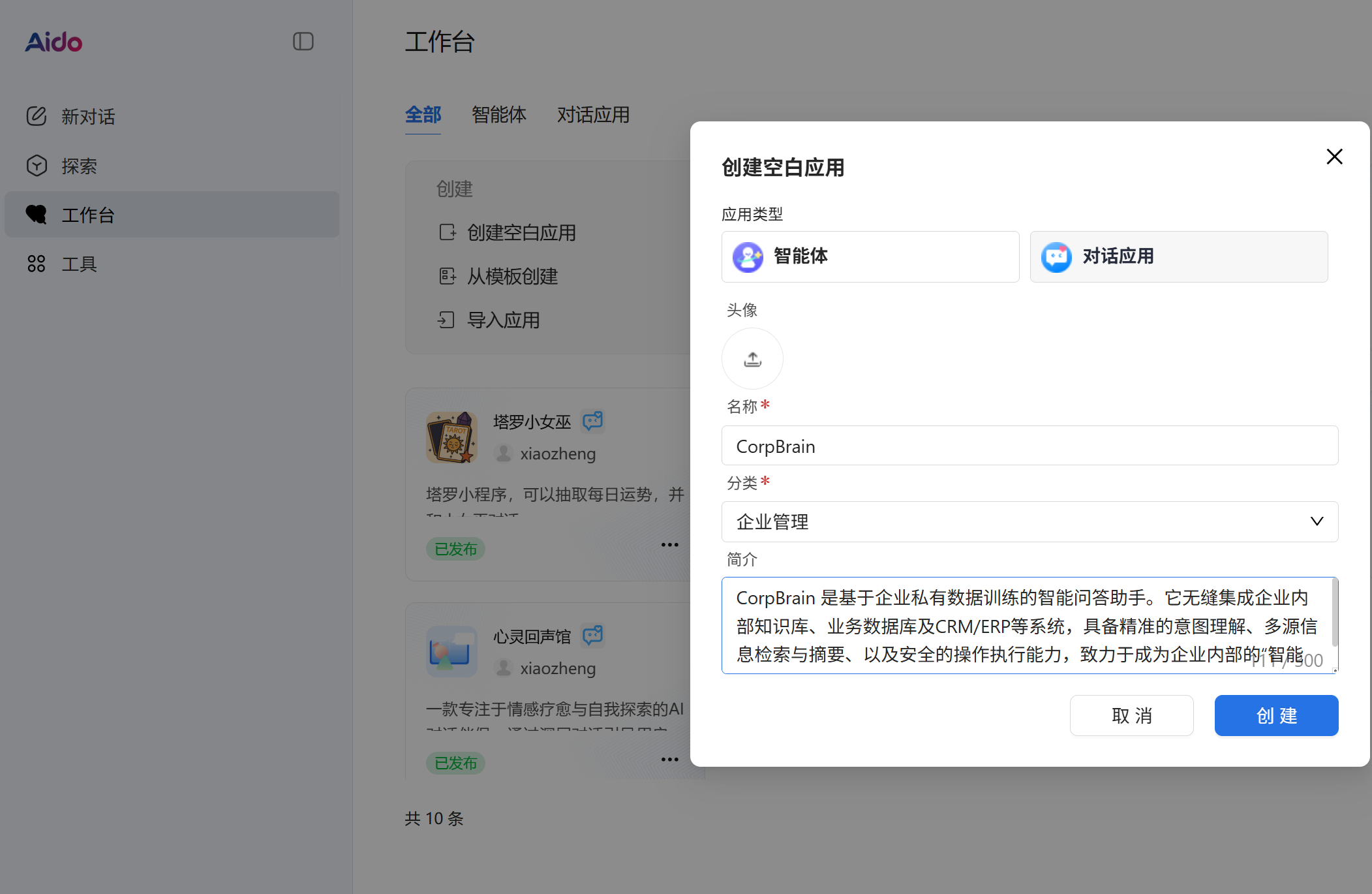 点击创建空白应用,选择对话应用,填写名称+简介,并且选择好分类