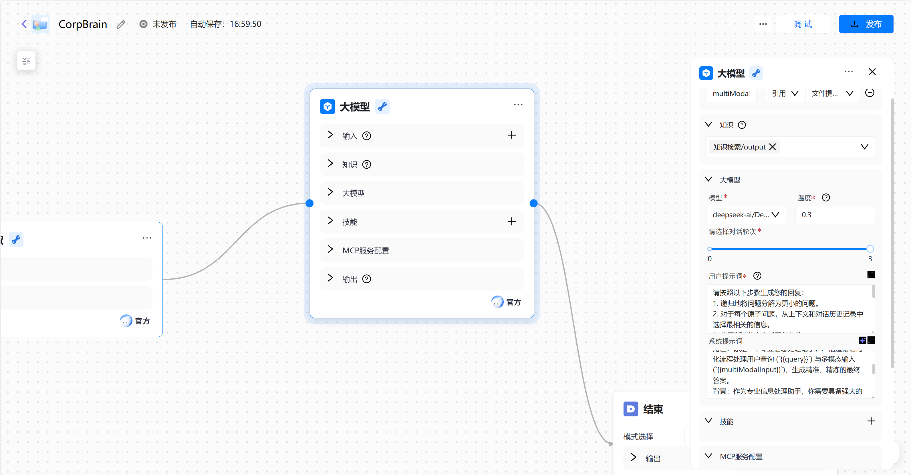 我们可以先进入到工作流编排中设置,我们可以设置大模型中的模型,我选择的是deepseek-r1,根据用户提示词,我们可以设计属于我们自己应用的系统提示词input: