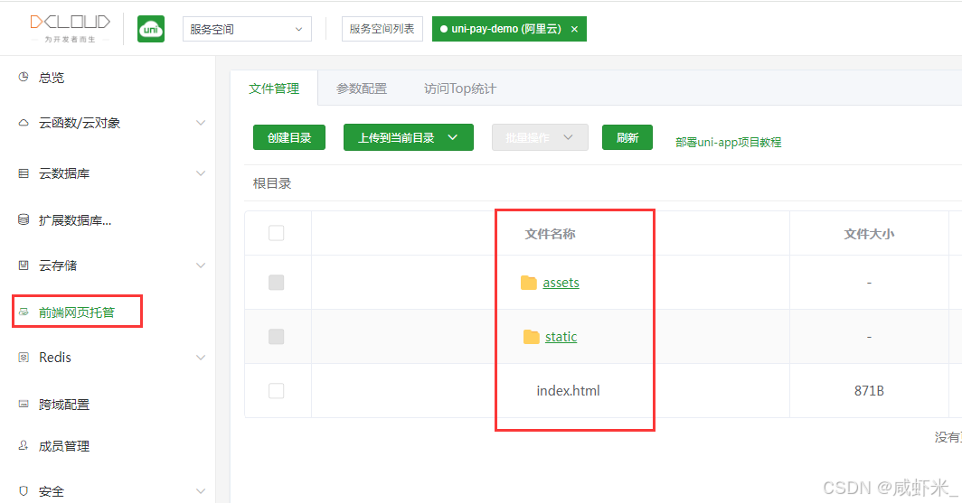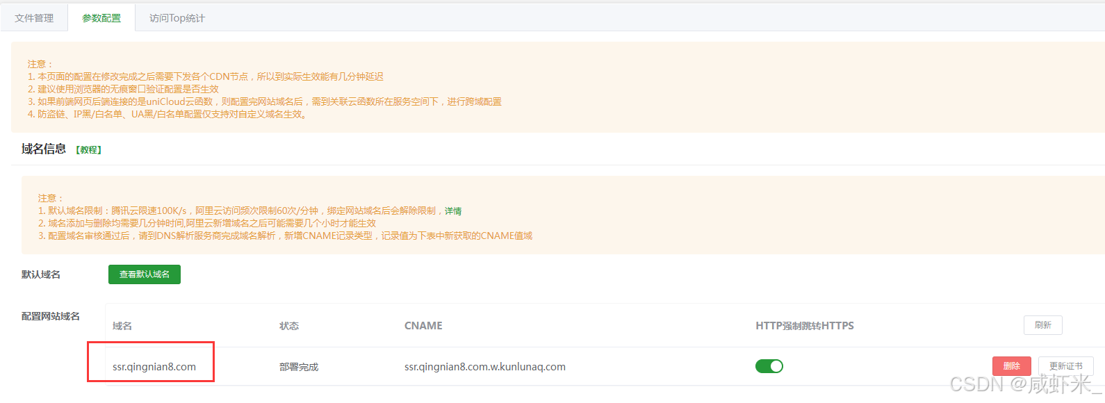 在前端网页托管中,可以看到刚刚打包好的文件,点击参数配置,里面有默认网址,可以直接使用默认网址来查看打包的网页了,默认网页每天有访问次数限制,仅做测试使用,如果想要可以一直使用,建议绑定自己的域名,可以查看这篇文章:uniCloud服务空间前端网页托管绑定自定义配置网站域名