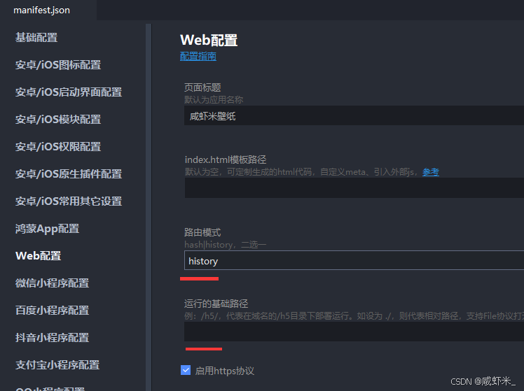 2.运行路径一定要为空,或者/线,千万不用用./,使用history路由模式放到web前端托管的话,是绝对不能放到二级目录的,只能在根目录下,所以这个位置要为空