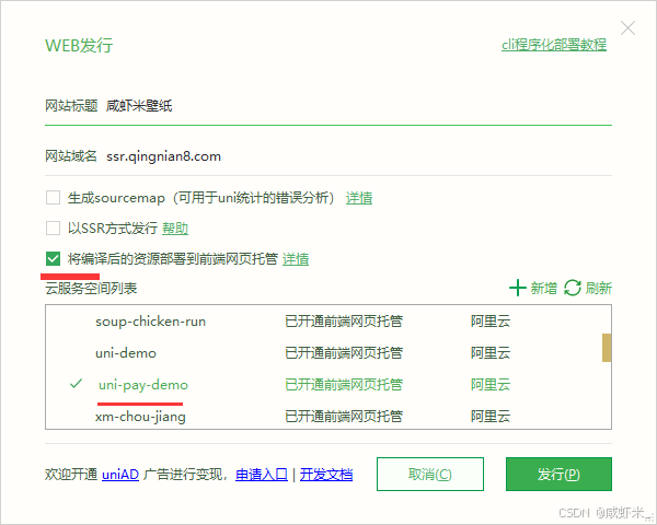 如果你没有服务器,那就直接放到unicloud的前端网页托管中,如果没有,点击右上角新增一个,发行的时候,直接勾选"将编译后的资源部署到前端网页托管",这样好处是打包完成后,自动商城到云端了,不需要你手动上传了。