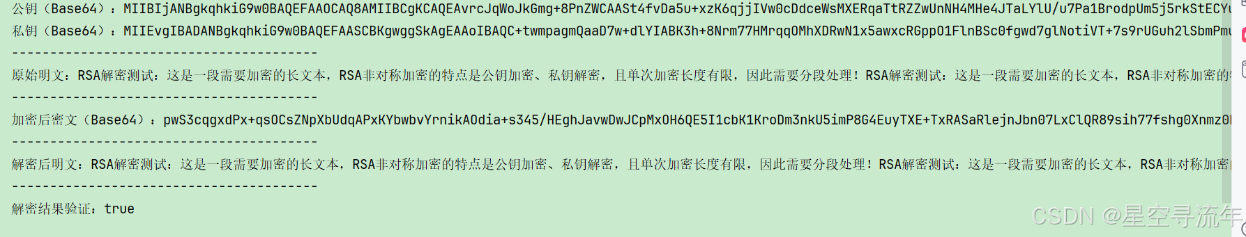 String plainText = "RSA解密测试:这是一段需要加密的长文本,RSA非对称加密的特点是公钥加密、私钥解密,且单次加密长度有限,因此需要分段处理!RSA解密测试:这是一段需要加密的长文本,RSA非对称加密的特点是公钥加密、私钥解密,且单次加密长度有限,因此需要分段处理!";