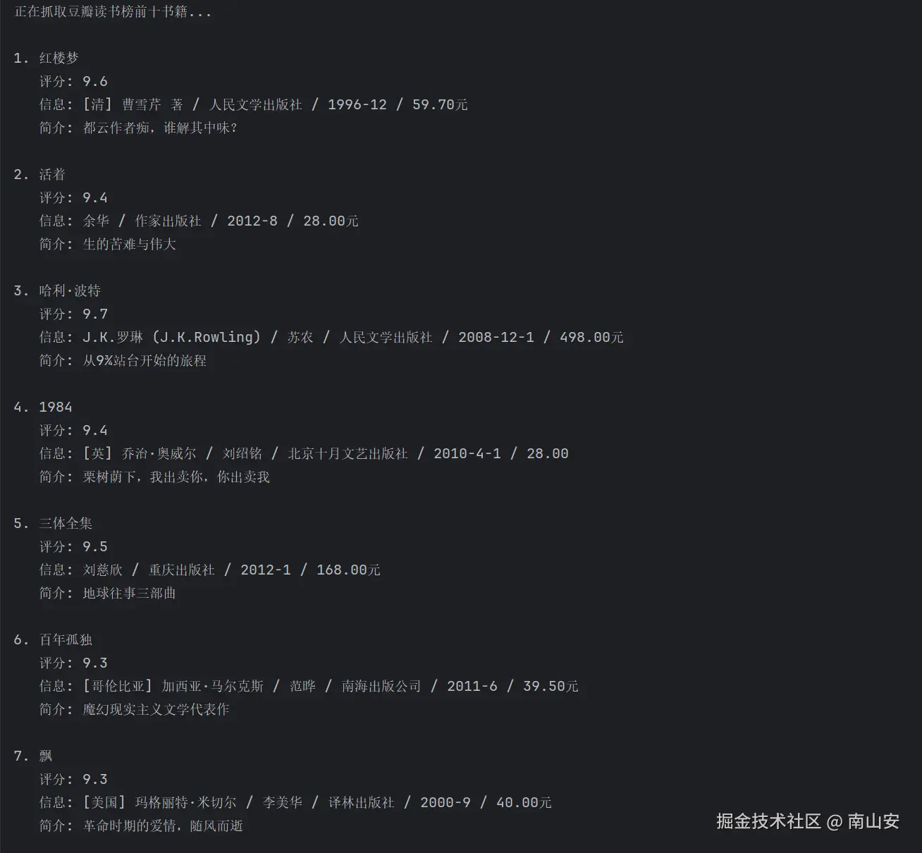 - 在终端输入自然语言:"创建一个Python爬虫,抓取豆瓣图书Top10,包括标题、评分、作者和简介。"