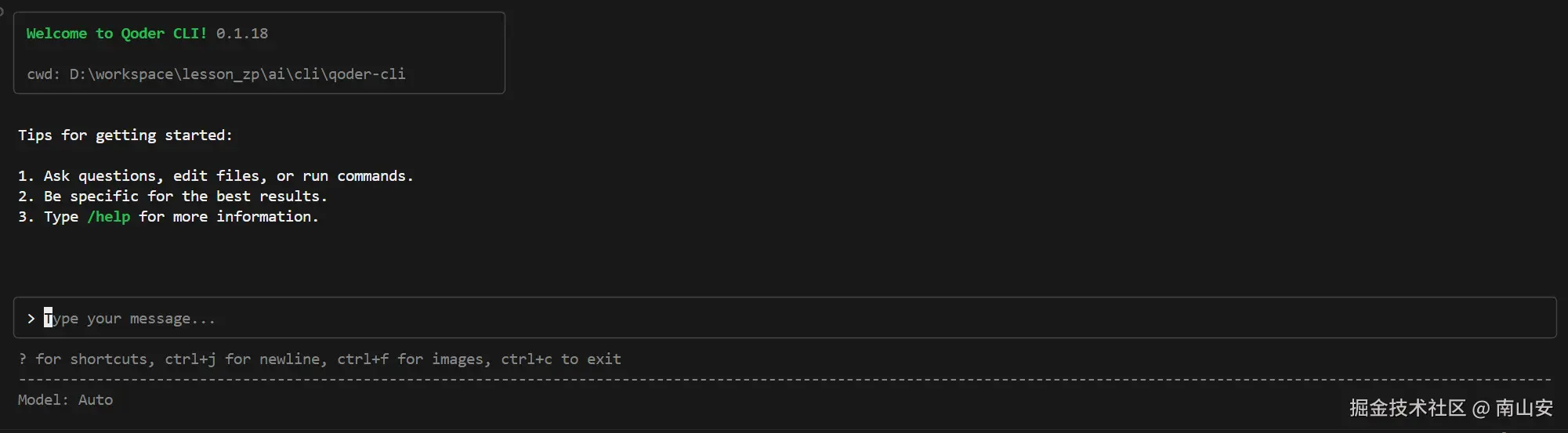 Qoder CLI会实时显示思考过程、代码变更、执行输出。按Enter发送消息,用 /help 查看所有斜杠命令。
