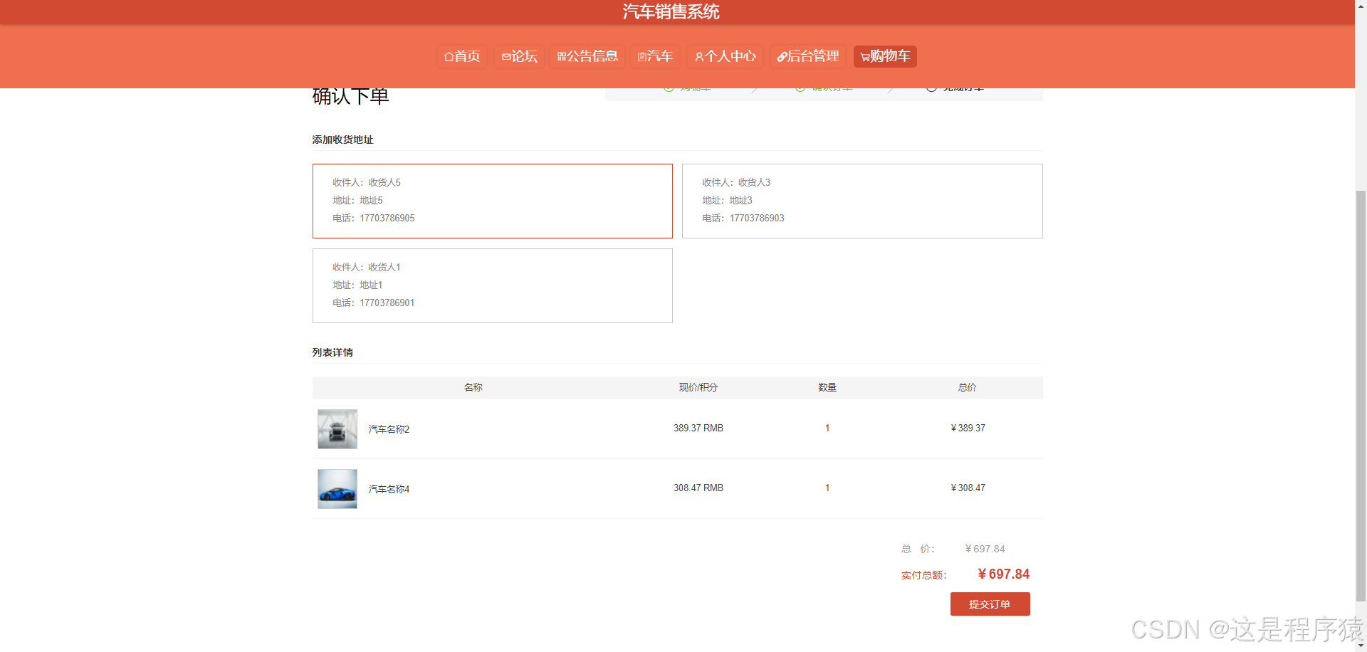 图5.10 即为编码实现的确认下单界面,用户先要确认收货地址,然后确认购买的汽车信息以及购买汽车的数量是否正确,最后确认支付的金额,然后提交订单。