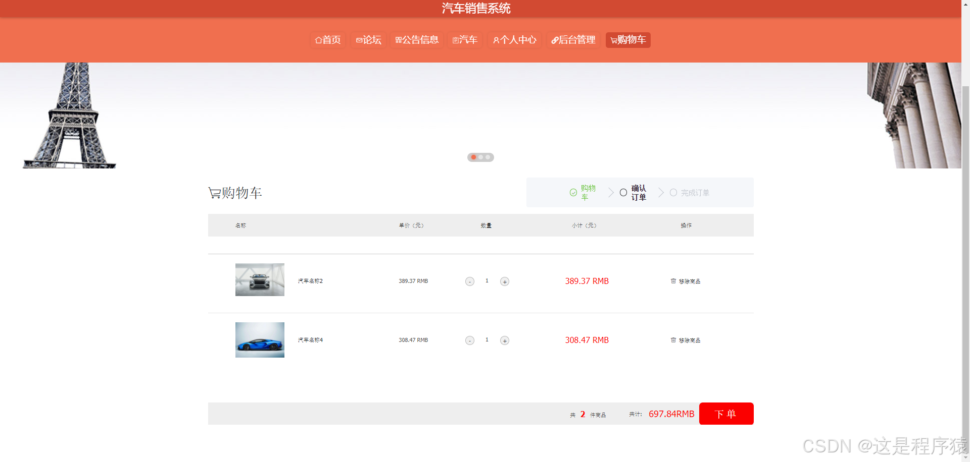 图5.9 即为编码实现的购物车界面,用户可以把需要购买的汽车都统一保存在购物车里面,然后对购买汽车的数量进行简单修改,最后对购买的汽车进行下单。
