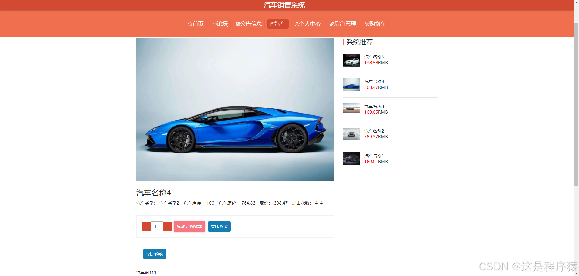 图5.7 即为编码实现的汽车信息界面,用户查看汽车信息界面右侧区域展示的系统推荐的汽车信息,可以通过汽车的图片以及汽车介绍来了解汽车,用户购买汽车可以通过购买功能实现下单,如果用户有对汽车试驾的需要,可以点击预约按钮对汽车试驾进行预约。