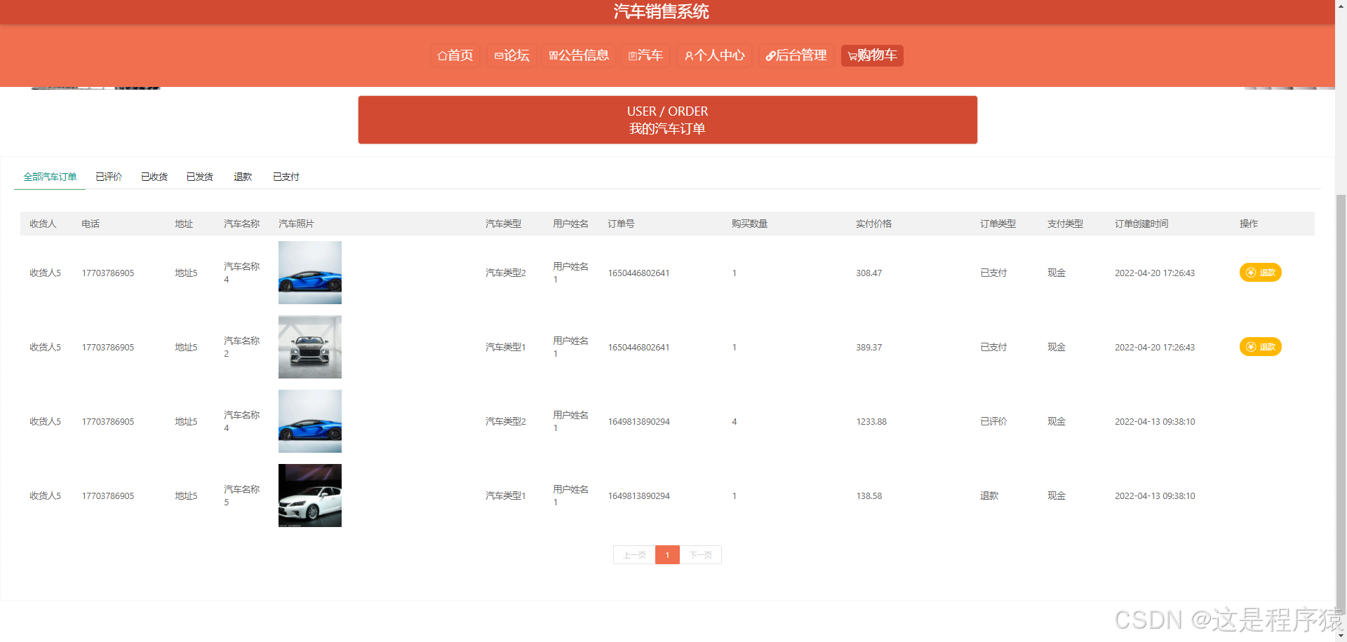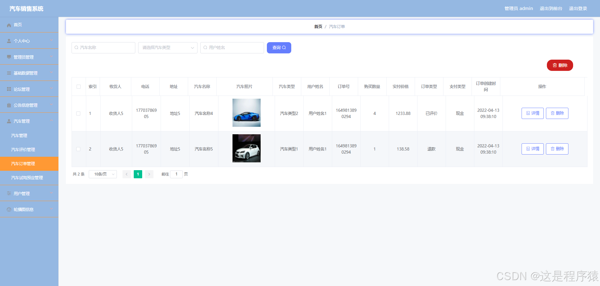 图5.6 即为编码实现的汽车订单管理界面,管理员查看汽车订单详情,包括购买数量,实付价格,支付类型等信息,可以删除需要删除的汽车订单等。