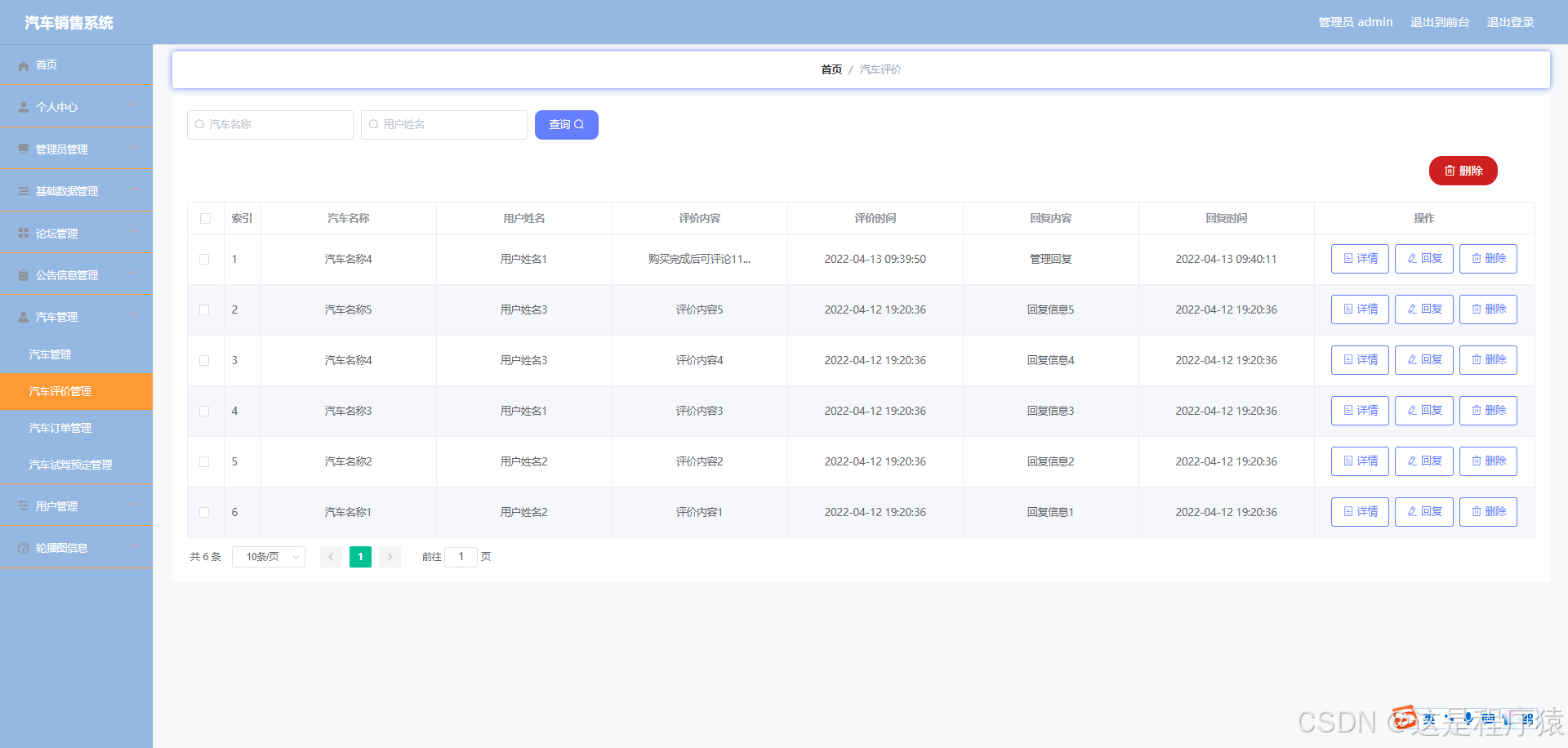 图5.4 即为编码实现的汽车评价管理界面,汽车评价信息有评价时间,评价内容,回复内容等,汽车评价是用户对汽车评价之后产生的信息,而回复信息则是管理员在查看汽车评价的内容之后,发布的回复信息。汽车评价管理界面展示的汽车评价信息也能让管理员删除和查询。
