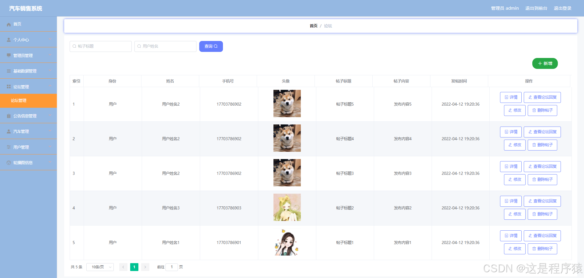 图5.1 即为编码实现的论坛管理界面,论坛信息包括帖子标题,帖子内容,发帖时间,身份,姓名,手机号等信息,管理员负责对有错误数据的论坛帖子使用修改功能及时更正信息,需要删除的论坛帖子可以使用删除功能及时删除,同时管理员通过查看论坛回复功能可以及时监督论坛帖子的回复信息,可以删除不良信息的论坛帖子回复信息,以及查看论坛帖子的各个回复信息等。