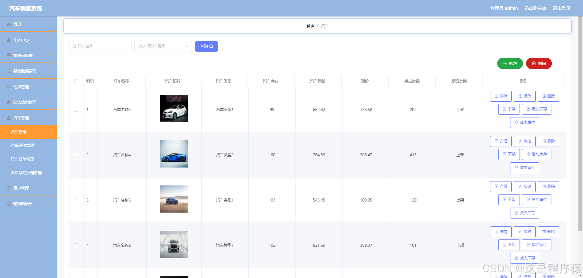 图5.3 即为编码实现的汽车管理界面,汽车信息有汽车原价,汽车现价,汽车照片,汽车名称等信息,管理员负责登记汽车信息,使用修改功能对登记错误的汽车信息进行更正,需要删除的汽车信息也能使用删除功能及时删除,同时管理员也能管理汽车的库存信息,主要包括对汽车库存进行增加,或者是对汽车库存进行减少,以及对销量不好的汽车进行下架,上架汽车新品等操作。