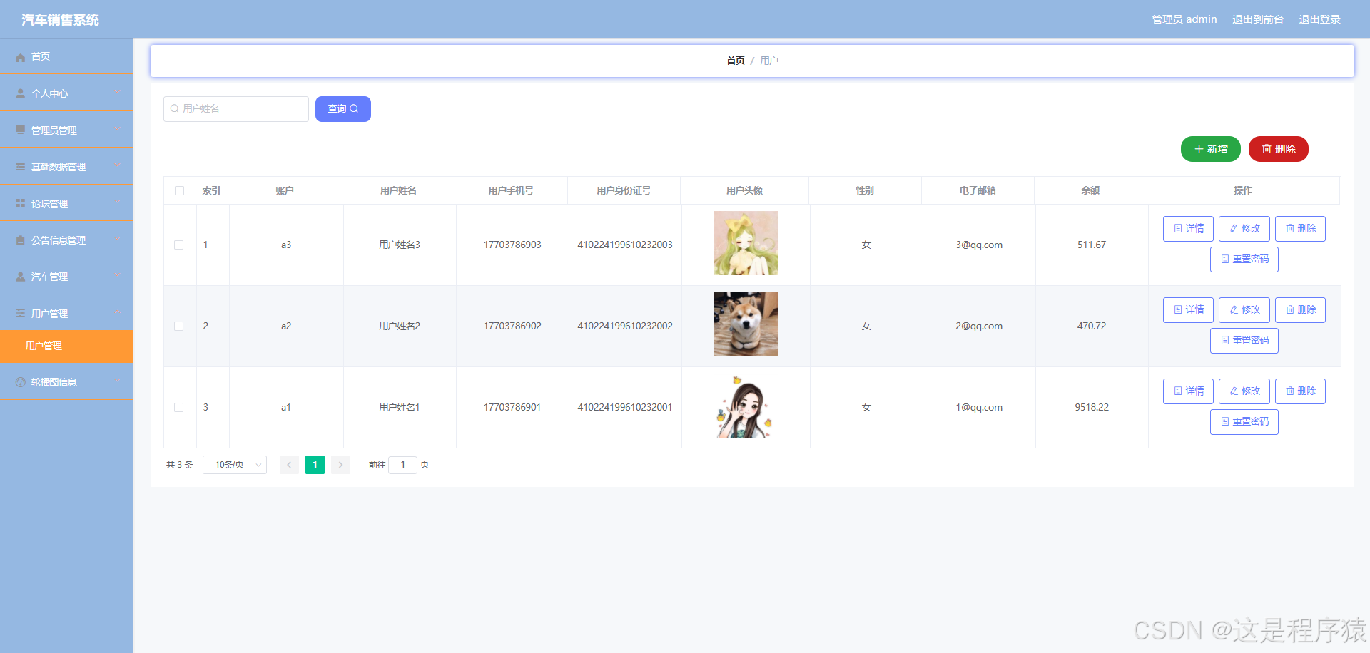 图5.2 即为编码实现的用户管理界面,用户信息有用户头像,余额,用户姓名等信息,管理员可以修改有错误数据的用户信息,可以使用删除功能删除需要删除的用户信息等。