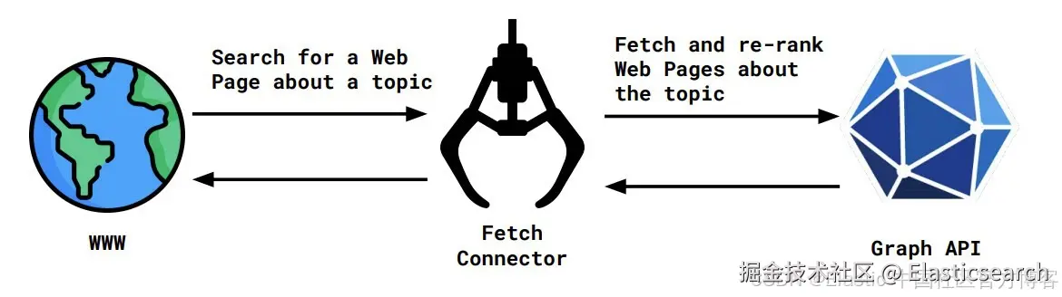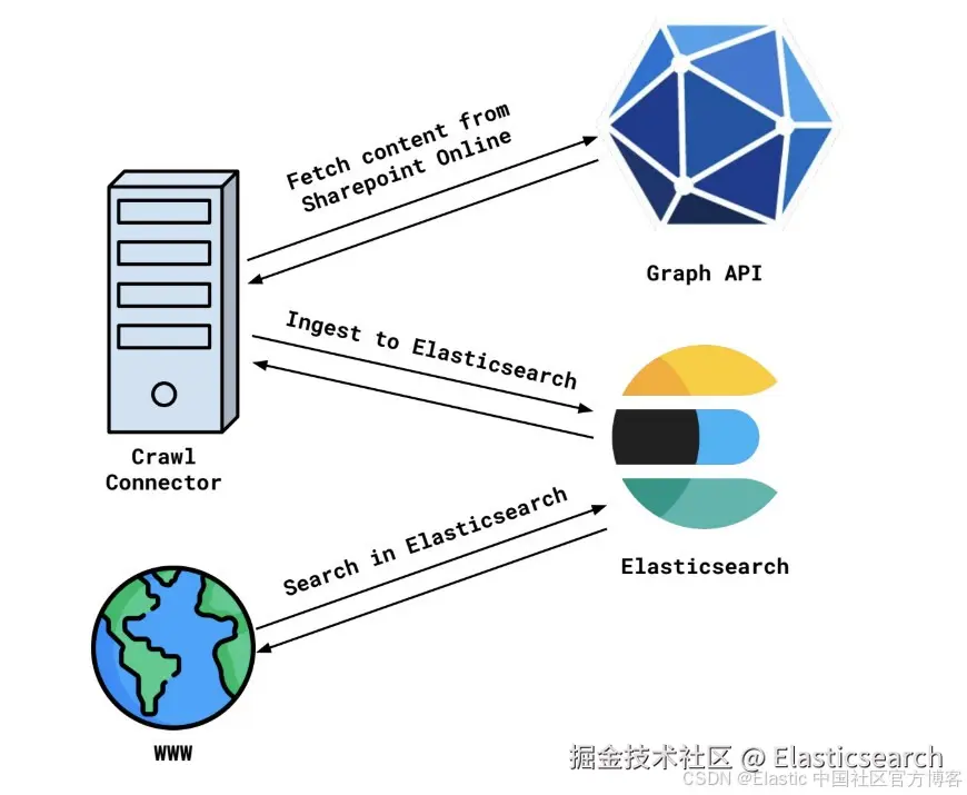 一个计划抓取(crawl)会启动,使用 Graph API 遍历 Sharepoint Online 实例的内容,然后将其存储到 Elasticsearch 或其他提供良好搜索能力的数据库中。对于用户需要搜索的每个系统重复这个过程,数据就存储在 Elasticsearch 中,并且可以很容易地通过你的网站进行搜索!这就是我们现有 Elastic content connectors 的工作方式。