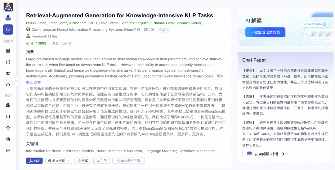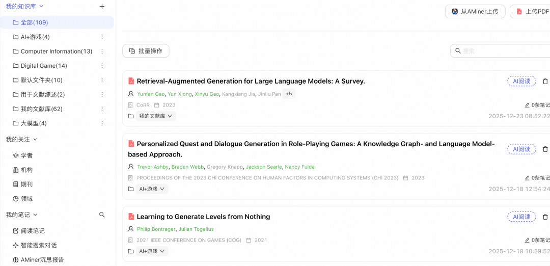 AMiner学术空间支持自建文件夹,从AMiner检索有全文的PDF或自行上传PDF(需要有全文PDF,才支持RAG查询)
