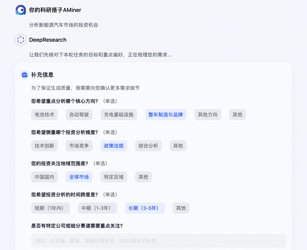 例如,输入"分析新能源汽车市场的投资机会",AMiner沉思会将其拆解为"核心分析方向"、"投资分析维度"、"投资关注地域范围"、"投资时间跨度"等多个并行或串行的子任务 ,并可以输入补充细分赛道和公司实体信息。