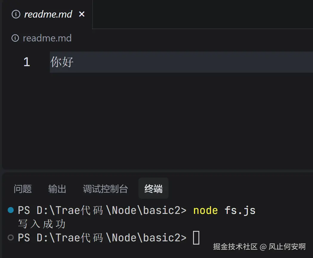 效果 :运行后,文件夹里会多出一个readme.md,打开就是 "你好"------ 相当于 Node.js 帮你写了个小文档!