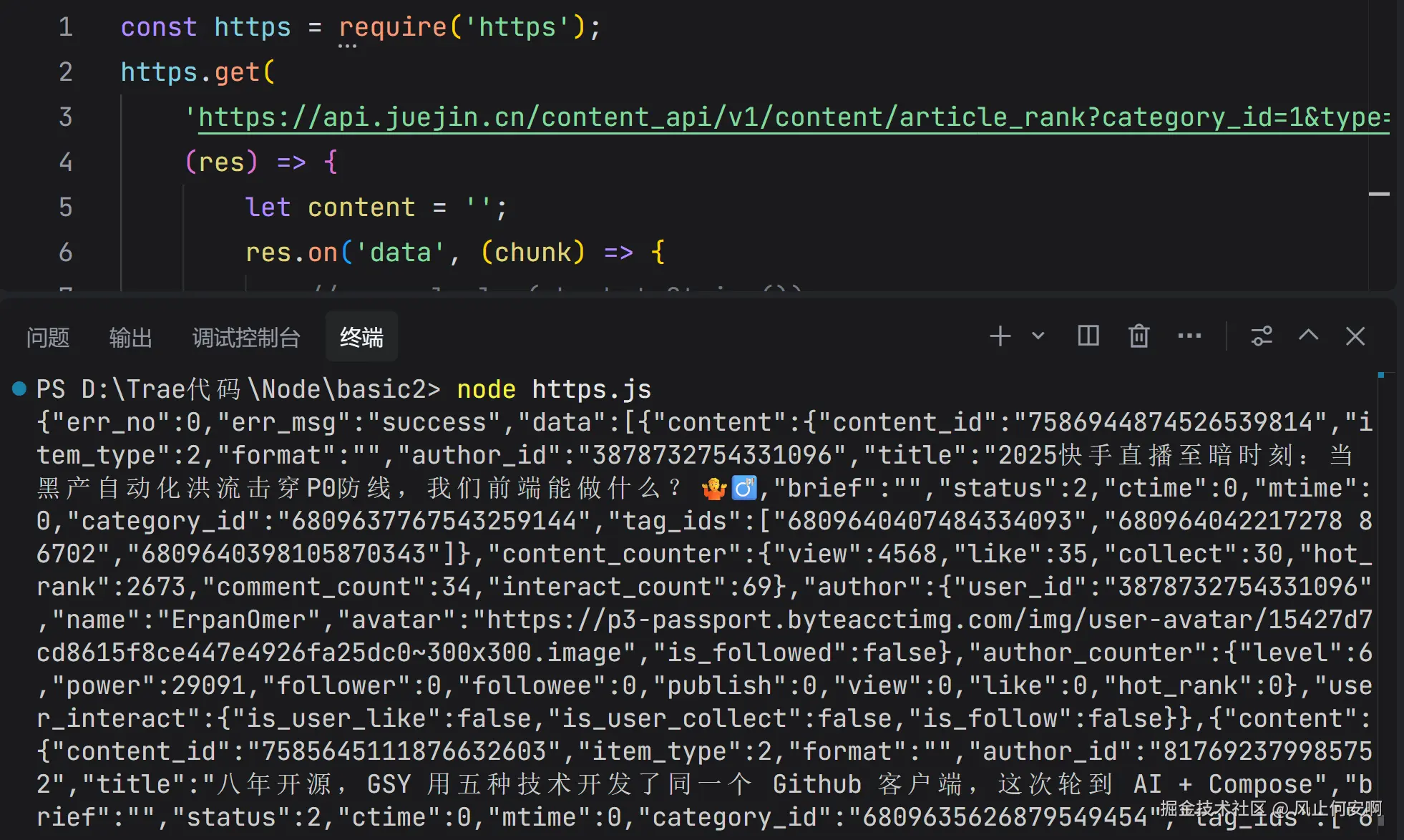 如果说http是 "开商店" ,那https模块就是 "去别人家商店买东西"------ 比如从掘金 API 里扒点热门文章: