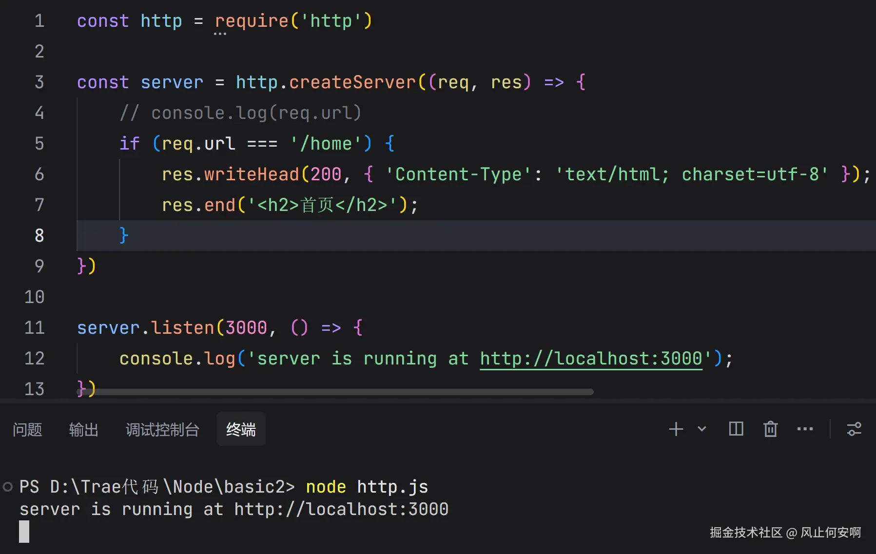 res.end('<h2>首页</h2>') // 把"首页"这两个字扔给浏览器