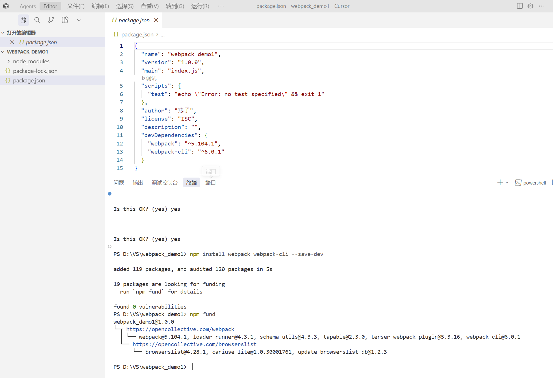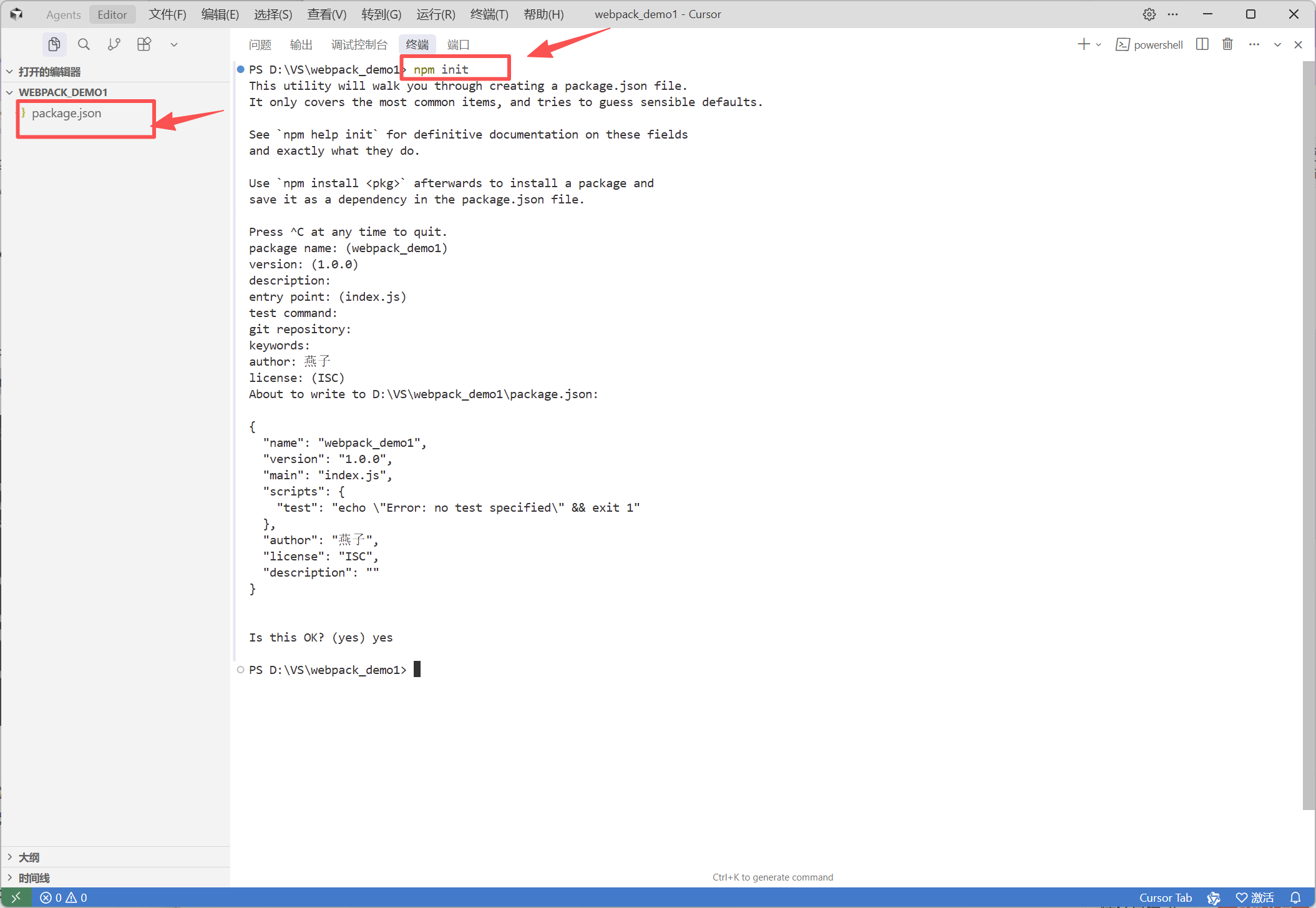 - 创建webpack_demo1的文件夹作为项目文件,使用终端进入文件夹, 使用npm init 命令初始化一个package.json文件