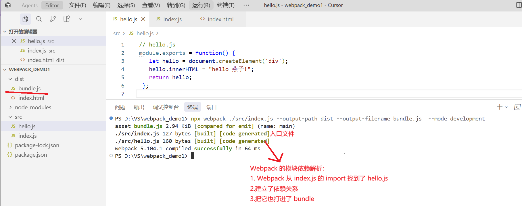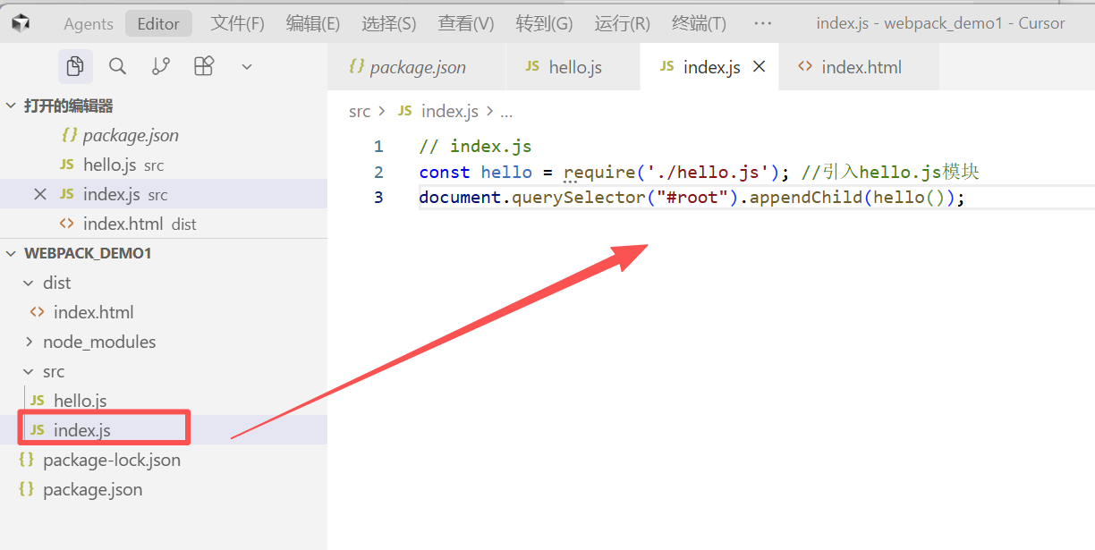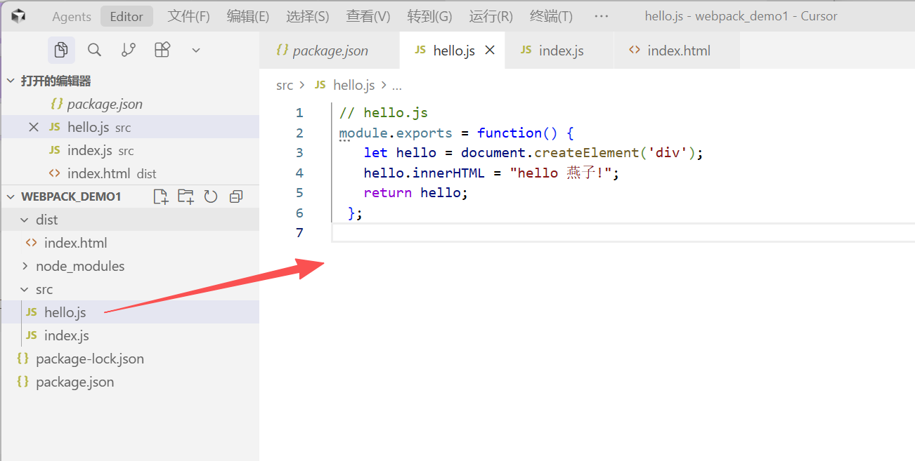 在webpack_demo文件夹下新建两个文件夹,分别为src文件夹和dist文件夹,接着在src文件夹下新增index.js文件和hello.js文件,在dist文件夹下新增index.html文件。