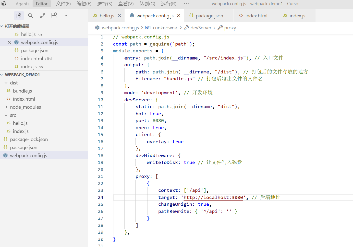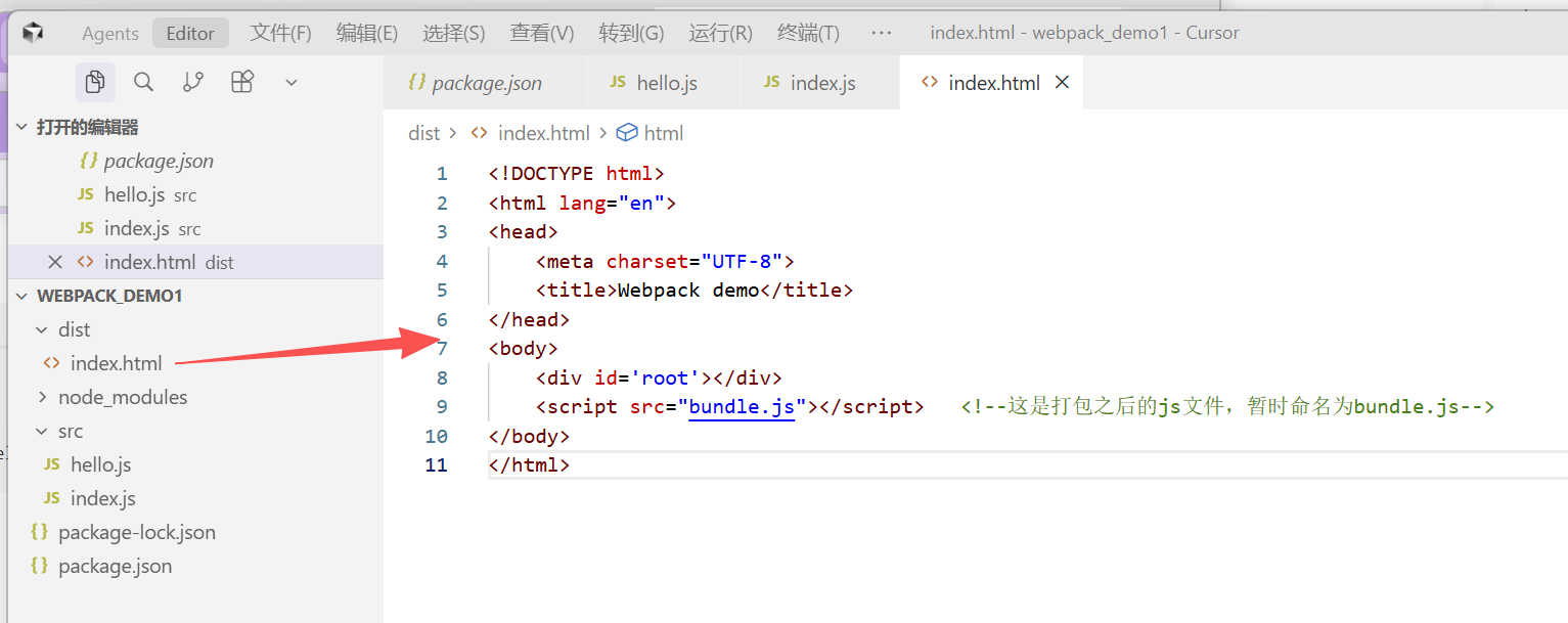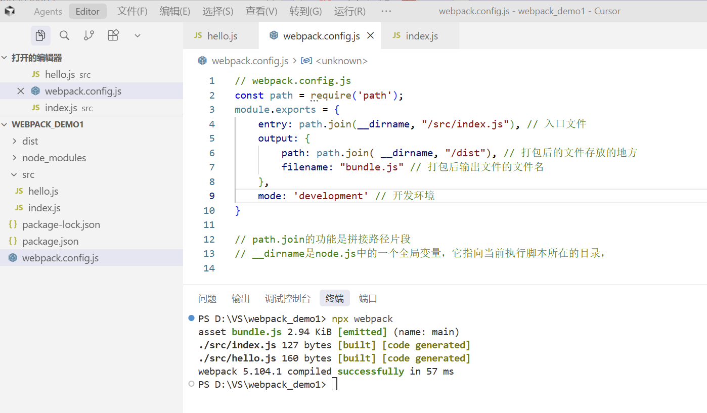 解释:使用 命令行配置进行打包。入口:./src/index.js。输出目录:dist。输出文件名:bundle.js。 --mode:打包模式。