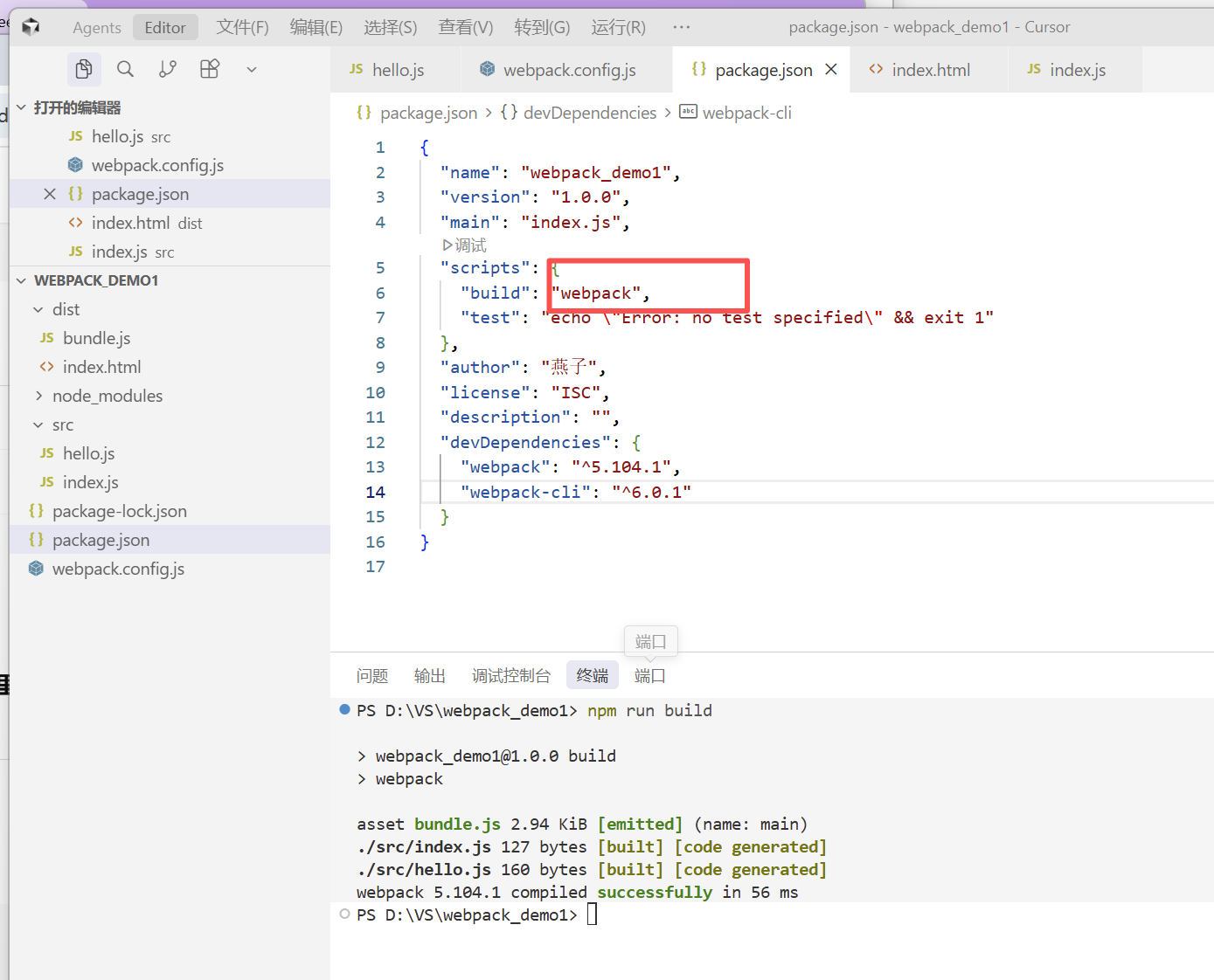 使用npm run build来运行该脚本命令。在这里添加每次都需要执行的命令,配置了scripts后, npm run key值相当于在终端运行了value值。npm run build = webpack。