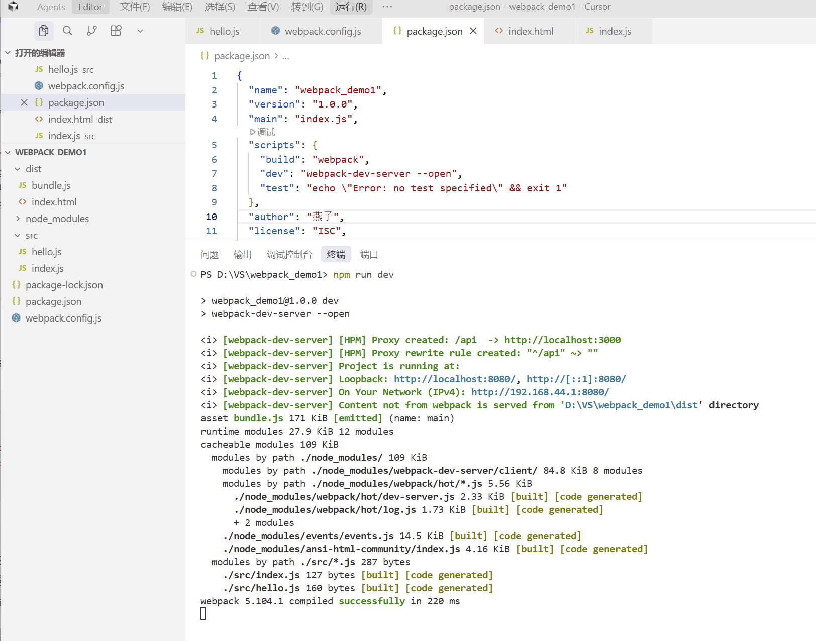在方法一是每次都在终端中输入的命令,接下来通过配置文件来使用webpack。