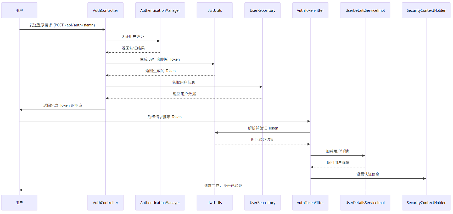 SecurityContextHolder UserDetailsServiceImpl AuthTokenFilter UserRepository JwtUtils AuthenticationManager AuthController 用户 SecurityContextHolder UserDetailsServiceImpl AuthTokenFilter UserRepository JwtUtils AuthenticationManager AuthController 用户 发送登录请求 (POST /api/auth/signin) 认证用户凭证 返回认证结果 生成 JWT 和刷新 Token 返回生成的 Token 获取用户信息 返回用户数据 返回包含 Token 的响应 后续请求携带 Token 解析并验证 Token 返回验证结果 加载用户详情 返回用户详情 设置认证信息 请求完成,身份已验证