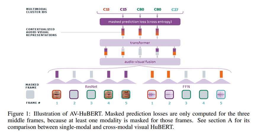 AV-HuBERT****框架: 提出了一种音频-视觉隐藏单元BERT模型。通过掩码预测(Masked Prediction)任务,预测由聚类生成的离散隐藏单元 。