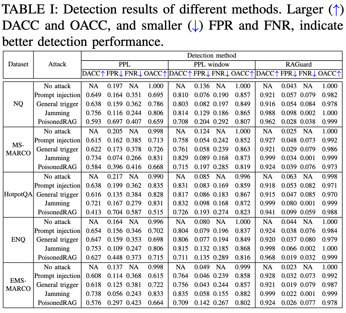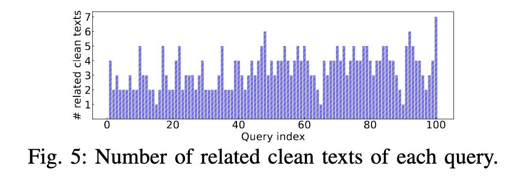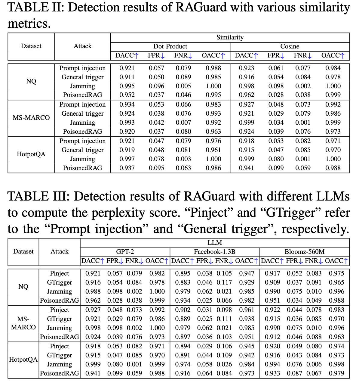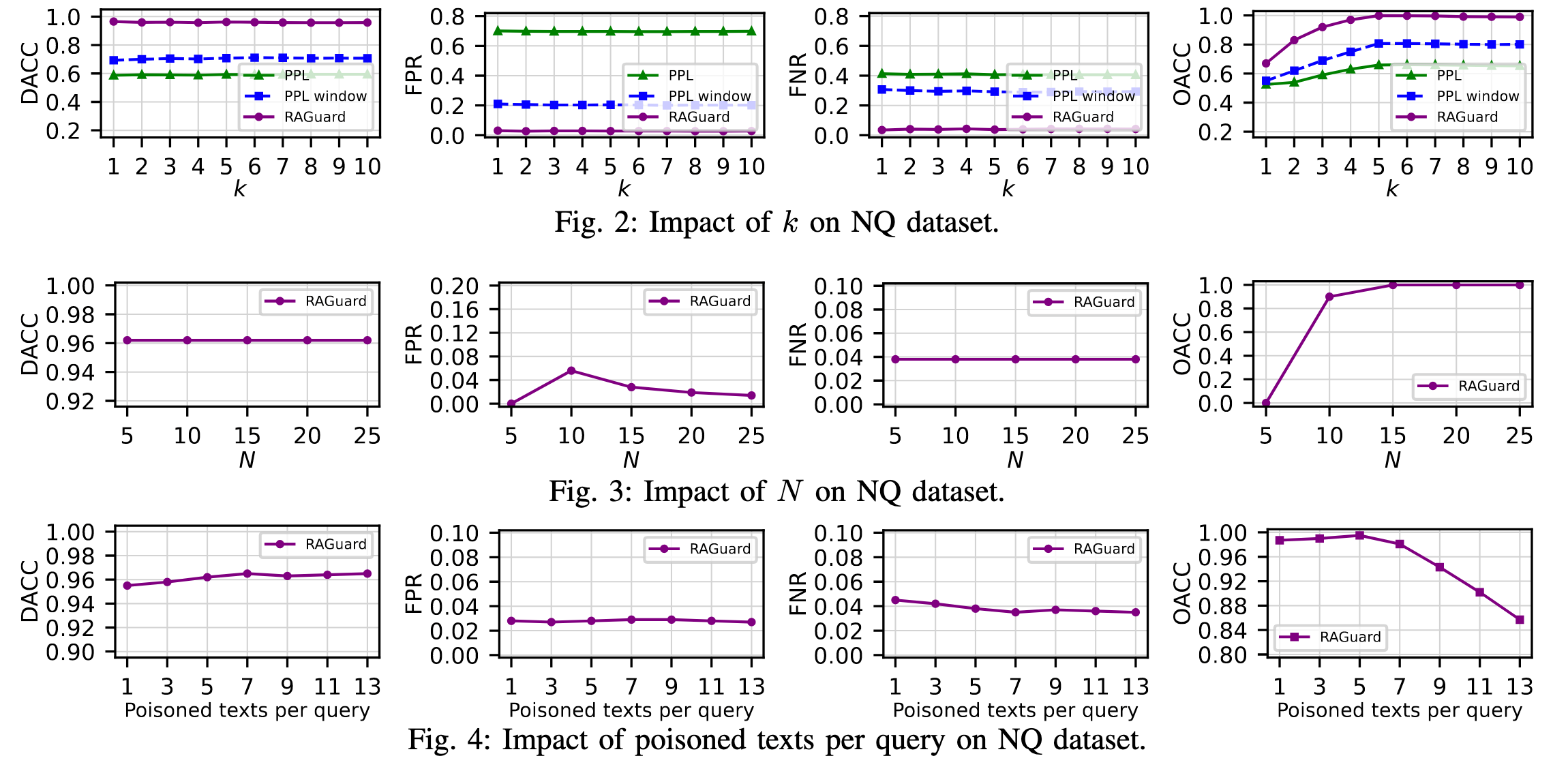 每个目标问题注入5个恶意文本,使用gpt3.5作为最终评估的模型,使用GPT2计算困惑度,使用点积计算相似度,使用Contriever检索器,检索top5个文本。RAGuard中N设置为3k,随机抽取1000个文本以构成集合S,显著性水平设置为α =2.5%