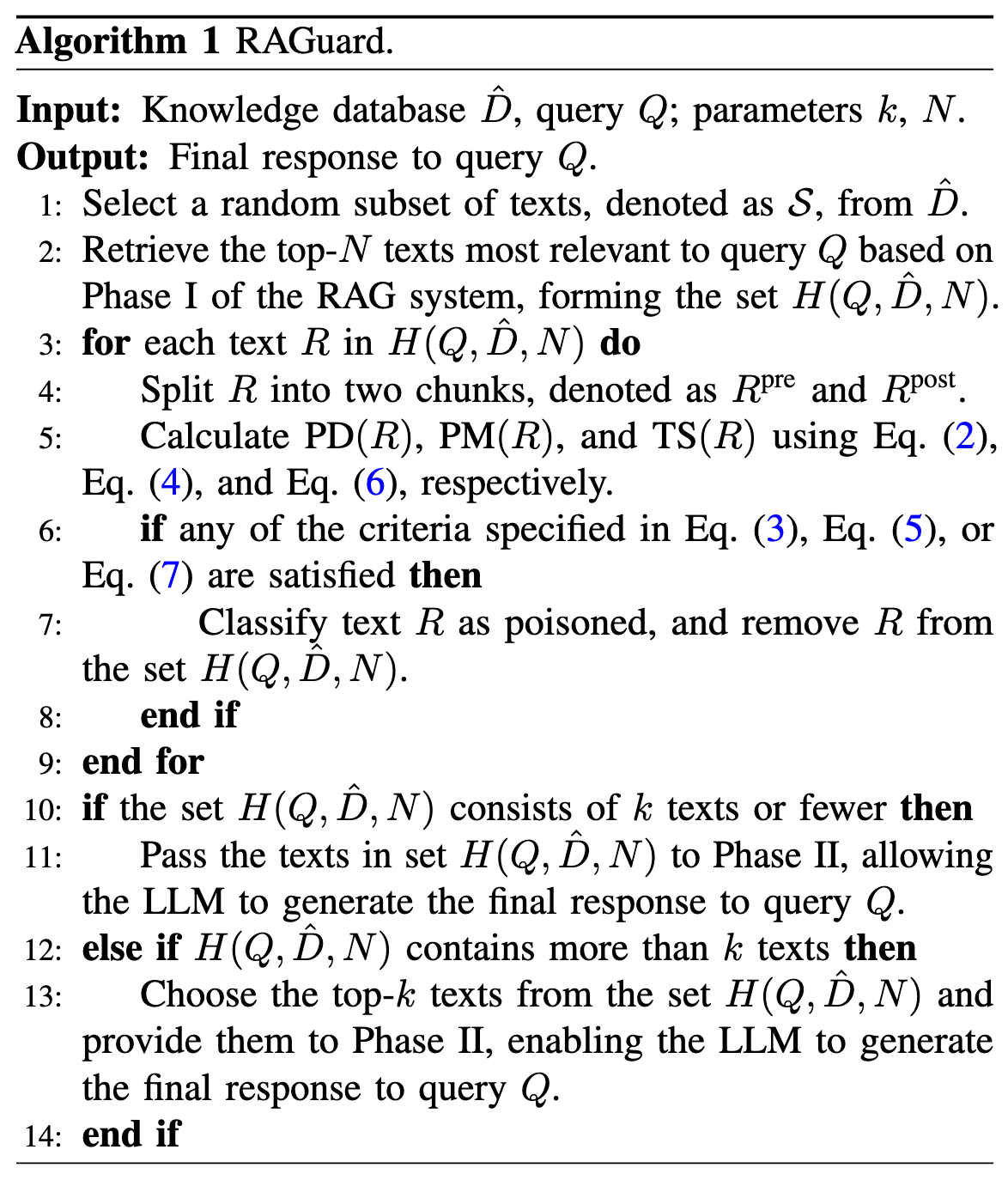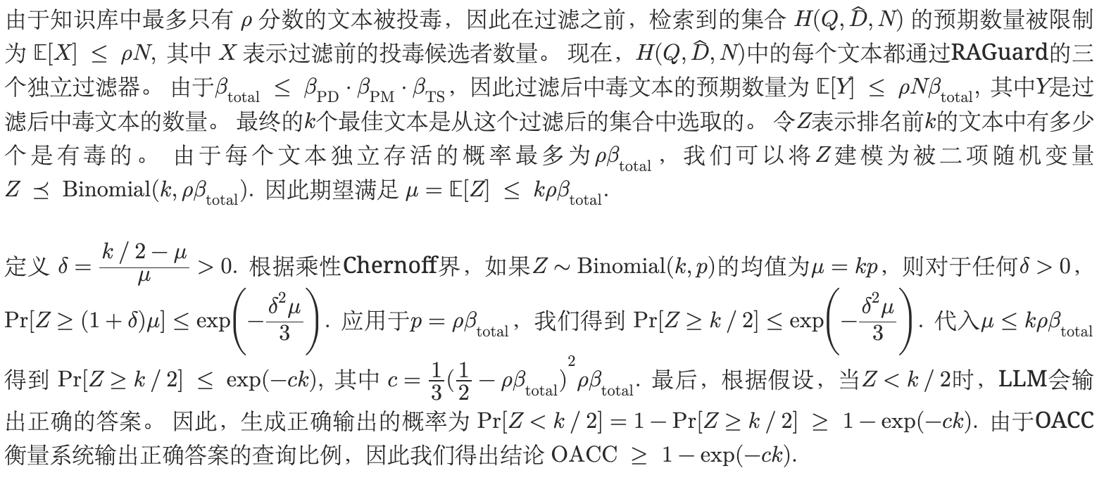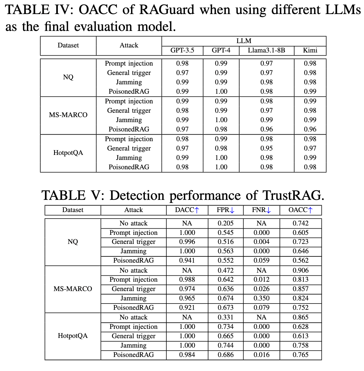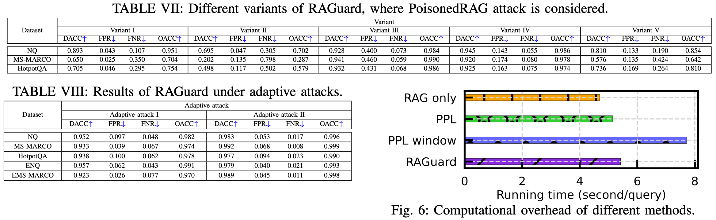 每个目标问题注入5个恶意文本,使用gpt3.5作为最终评估的模型,使用GPT2计算困惑度,使用点积计算相似度,使用Contriever检索器,检索top5个文本。RAGuard中N设置为3k,随机抽取1000个文本以构成集合S,显著性水平设置为α =2.5%