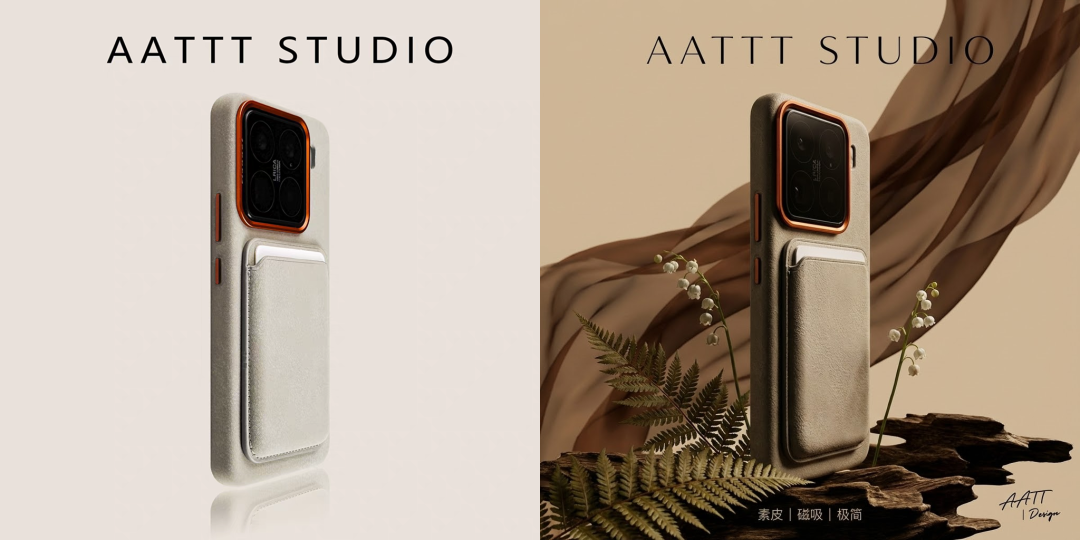 Prompt: Design a product poster for this beige leather phone case. Super close-up of the case standing sideways, clearly showing the fine texture of vegan leather and the contrasting texture of orange metal camera ring, with magnetic card pocket of same color attached to back. Beige background with brown transparent light gauze surrounding, decorated with several fern plants, agarwood dead wood and two lily of the valley as foreground accents. 4K ultra-high definition image quality. Still life photography, dark atmosphere, light ray tracing, premium soft light. Poster title at top: "AATTT STUDIO", ultra-thin serif font. Small text at bottom: "Vegan Leather | Magnetic | Minimalist". Artistic signature corner tag: "AATTT | Design"