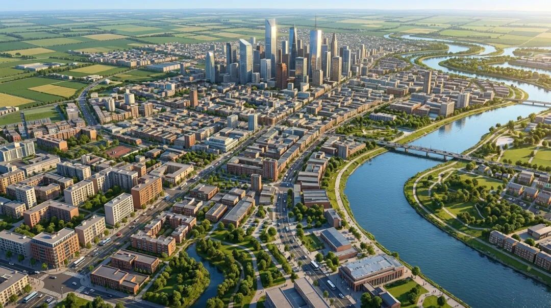 Prompt : Based on this line art, generate a detailed urban design rendering