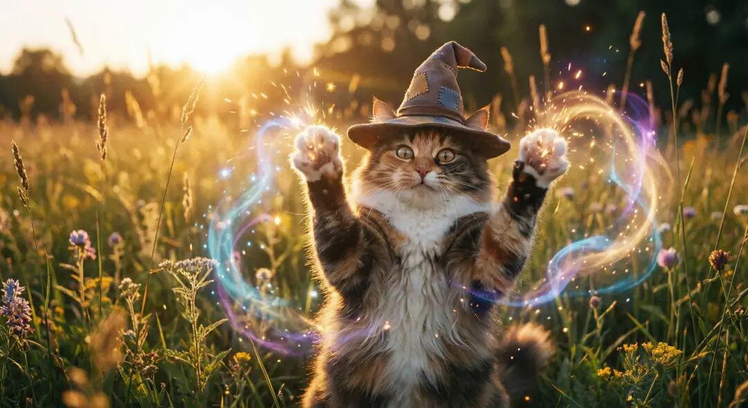 Example: A fluffy calico cat wearing a small wizard hat, casting magic on a sunlit grassland at sunset, low-angle shot, photorealism